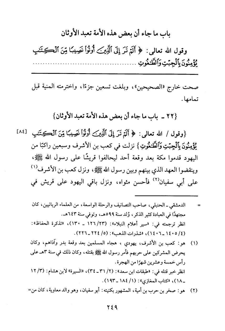 وقول الله تعالى: {أَلَمْ تَرَ إِلَى الَّذِينَ أُوتُوا نَصِيباً مِنَ الْكِتَابِ يُؤْمِنُونَ بِالْجِبْتِ وَالطَّاغُوتِ