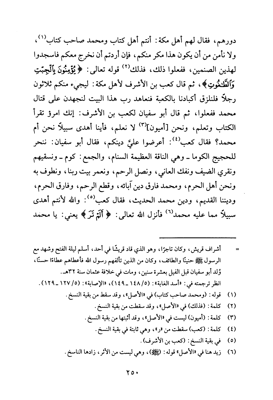 دورهم، فقال لهم أهل مكة: أنتم أهل كتاب ومحمد صاحب كتاب،1 ولا نأمن من أن يكون هذا مكر منكم، فإن أردتم أن نخرج معكم فاسجدوا لهذين الصنمين، ففعلوا ذلك، فذلك2 قوله تعالى: {يُؤْمِنُونَ بِالْجِبْتِ وَالطَّاغُوتِ} ثم قال كعب بن الأشرف لأهل مكة: ليجيء منكم ثلاثون رجلا فلنلزق أكبادنا بالكعبة فنعاهد رب هذا البيت لنجهدن على قتال محمد ففعلوا، ثم قال أبو سفيان لكعب بن الأشرف: إنك امرؤ تقرأ الكتاب وتعلم، ونحن [أميون] 3 لا نعلم، فأينا أهدى سبيلا نحن أم محمد؟ فقال كعب:4 أعرضوا علي دينكم، فقال أبو سفيان: ننحر للحجيج الكوما -وهي الناقة العظيمة السنام، والجمع: كوم- ونسقيهم ونقري الضيف ونفك العاني، ونصل الرحم، ونعمر بيت ربنا، ونطوف به ونحن أهل الحرم، ومحمد فارق دين آبائه، وقطع الرحم، وفارق الحرم، وديننا القديم، ودين محمد الحديث، فقال كعب:5 والله لأنتم أهدى سبيلا مما عليه محمد6 فأنزل الله تعالى: {أَلَمْ تَرَ} يعني: يا محمد