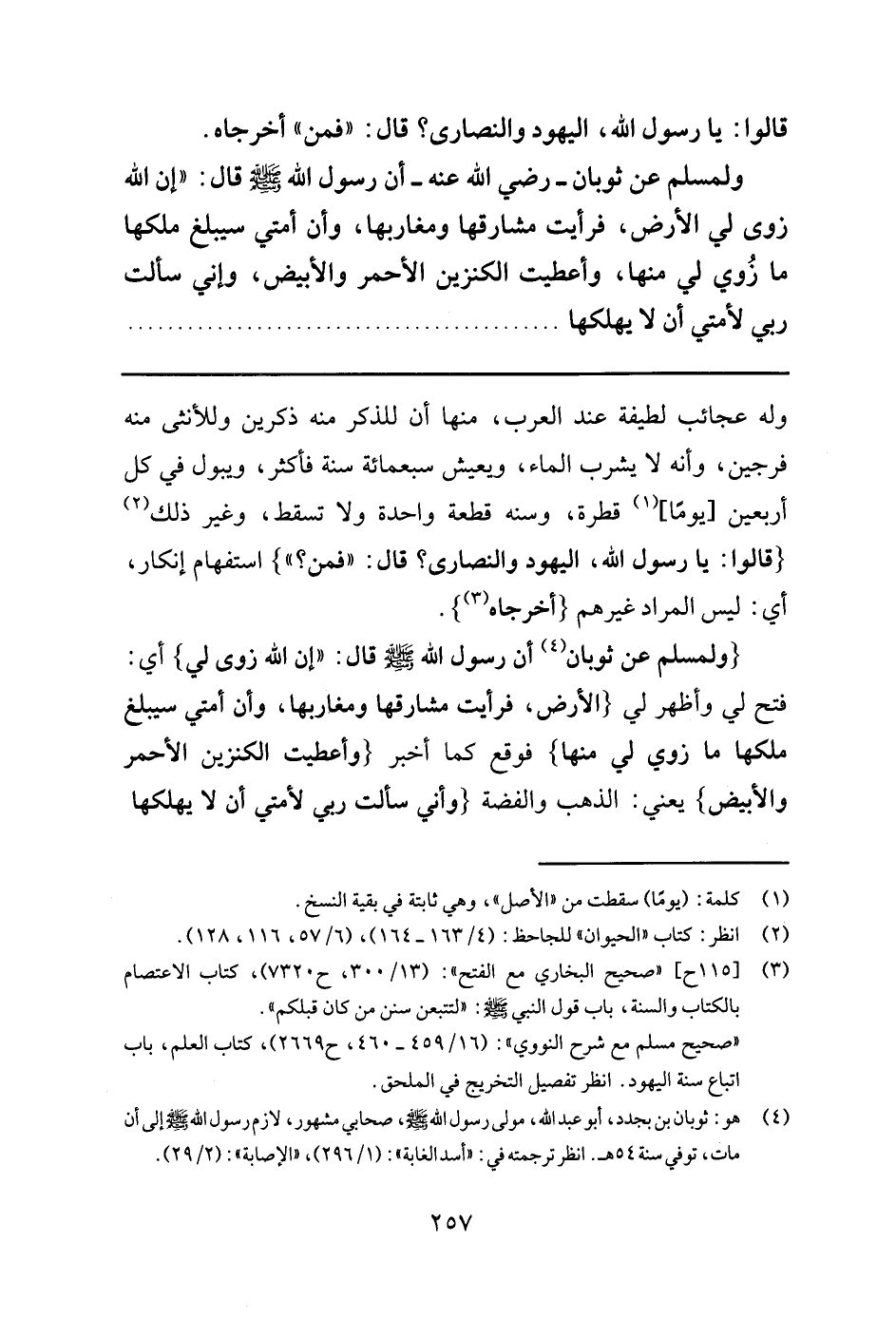 4 هو: ثوبان بن بجدد, أبو عبد الله, مولى رسول الله - صلى الله عليه وسلم - , صحابي مشهور, لازم رسول الله - صلى الله عليه وسلم - إلى أن مات, توفي سنة 54 هـ. انظر ترجمته في:"أسد الغابة": (1/ 296) ,"الإصابة": (2/ 29) .