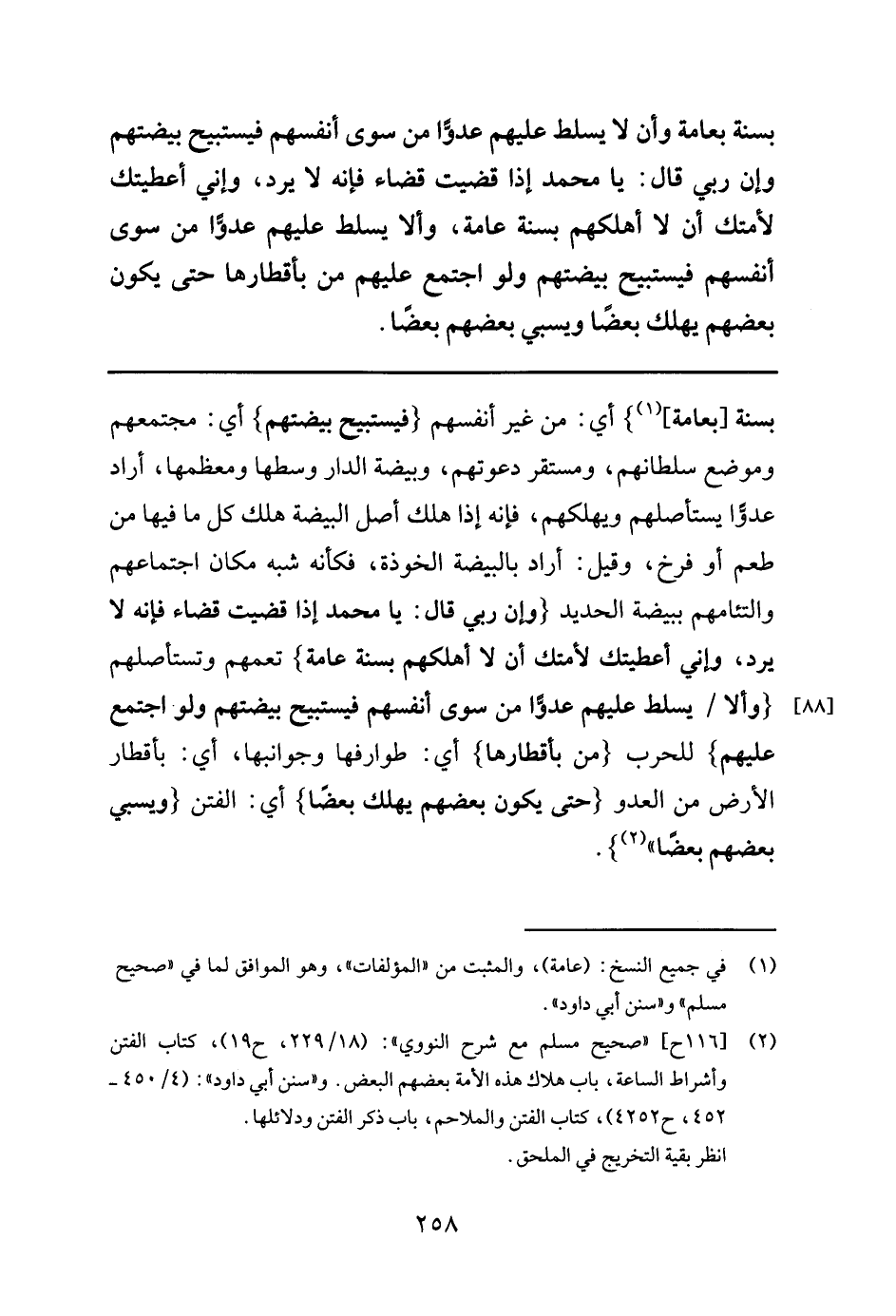 2 [116 ح] "صحيح مسلم مع شرح النووي": (18/ 229, ح 19) , كتاب الفتن وأشراط الساعة, باب هلاك هذه الأمة بعضهم البعض. و"سنن أبي داود": (4/ 450- 452, ح 4252) , كتاب الفتن والملاحم, باب ذكر الفتن ودلائلها. انظر بقية التخريج في الملحق.
