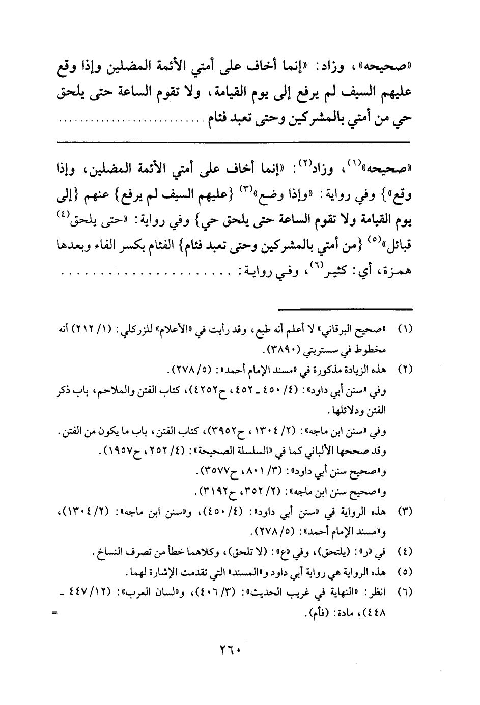 "صحيحه"، وزاد: " إنما أخاف على أمتي الأئمة المضلين وإذا وقع عليهم السيف لم يرفع إلى يوم القيامة، ولا تقوم الساعة حتى يلحق حي من أمتي بالمشركين وحتى تعبد فئام