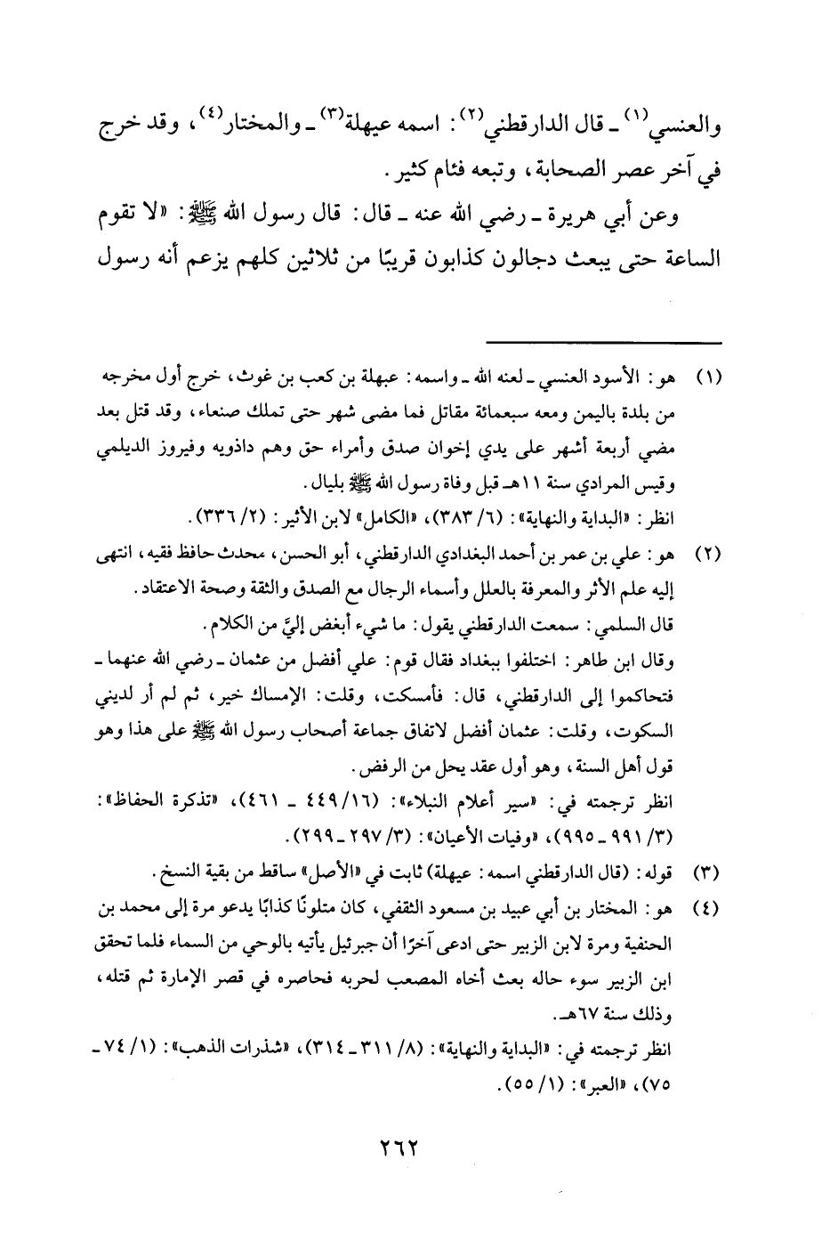 والعنسي1 -قال الدارقطني:2 اسمه عيهلة3 - والمخ4 وقد خرج في آخر عصر الصحابة، وتبعه فئام كثير. وعن أبي هريرة رضي الله عنه قال: قال رسول الله صلى الله عليه وسلم " لا تقوم الساعة حتى يبعث دجالون كذابون قريبًا من ثلاثين كلهم يزعم أنه رسول