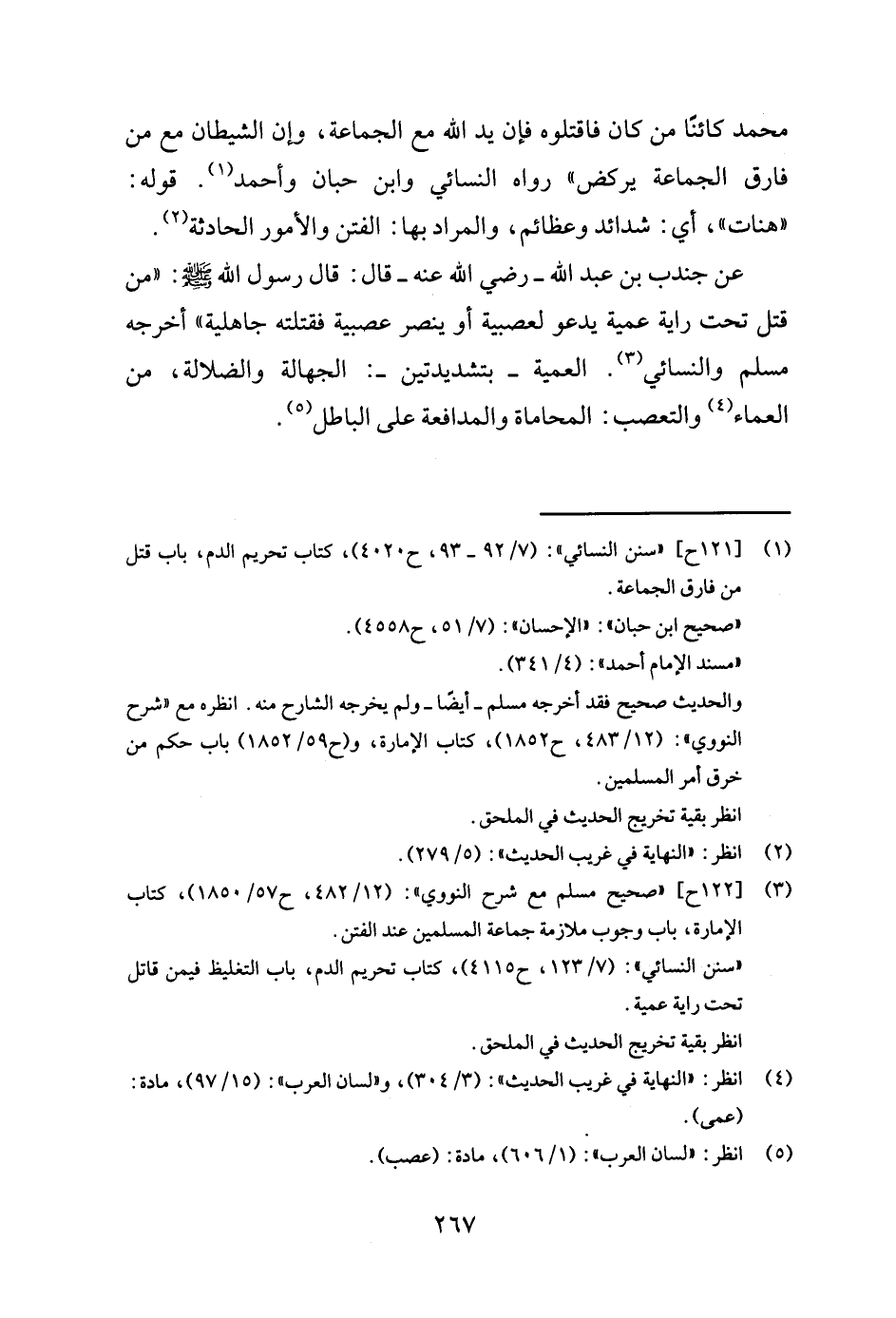 محمد كائنا من كان فاقتلوه فإن يد الله مع الجماعة، وإن الشيطان مع من فارق الجماعة يركض " رواه النسائي وابن حبان وأحمد.1 قوله:"هنات"، أي: شدائد وعظائم، والمراد بها: الفتن والأمور الحادثة.2 عن جندب بن عبد الله رضي الله عنهقال: قال رسول الله صلى الله عليه وسلم " من قتل تحت راية عمية يدعو لعصبية أو ينصر عصبية فقتلته جاهلية "3 أخرجه مسلم والنسائي.4 العمية- بتشديدتين-: الجهالة والضلالة، من العماء5 والتعصب: المحاماة والمدافعة على الباطل.6
