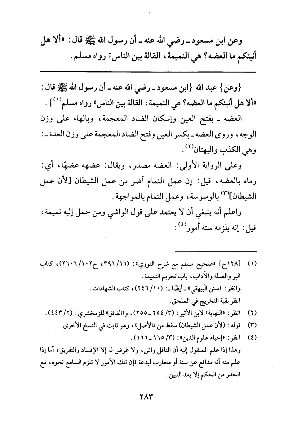 4 انظر:"إحياء علوم الدين": (3/ 165- 166) . وهذا إذا علم المنقول إليه أن الناقل واش, ولا غرض له إلا الإفساد والتفريق, أما إذا علم منه أنه مدافع عن سنة أو محارب لبدعة فإن تلك الأمور لا تلزم السامع نحوه, مع الحذر من الحكم إلا بعد التبين.