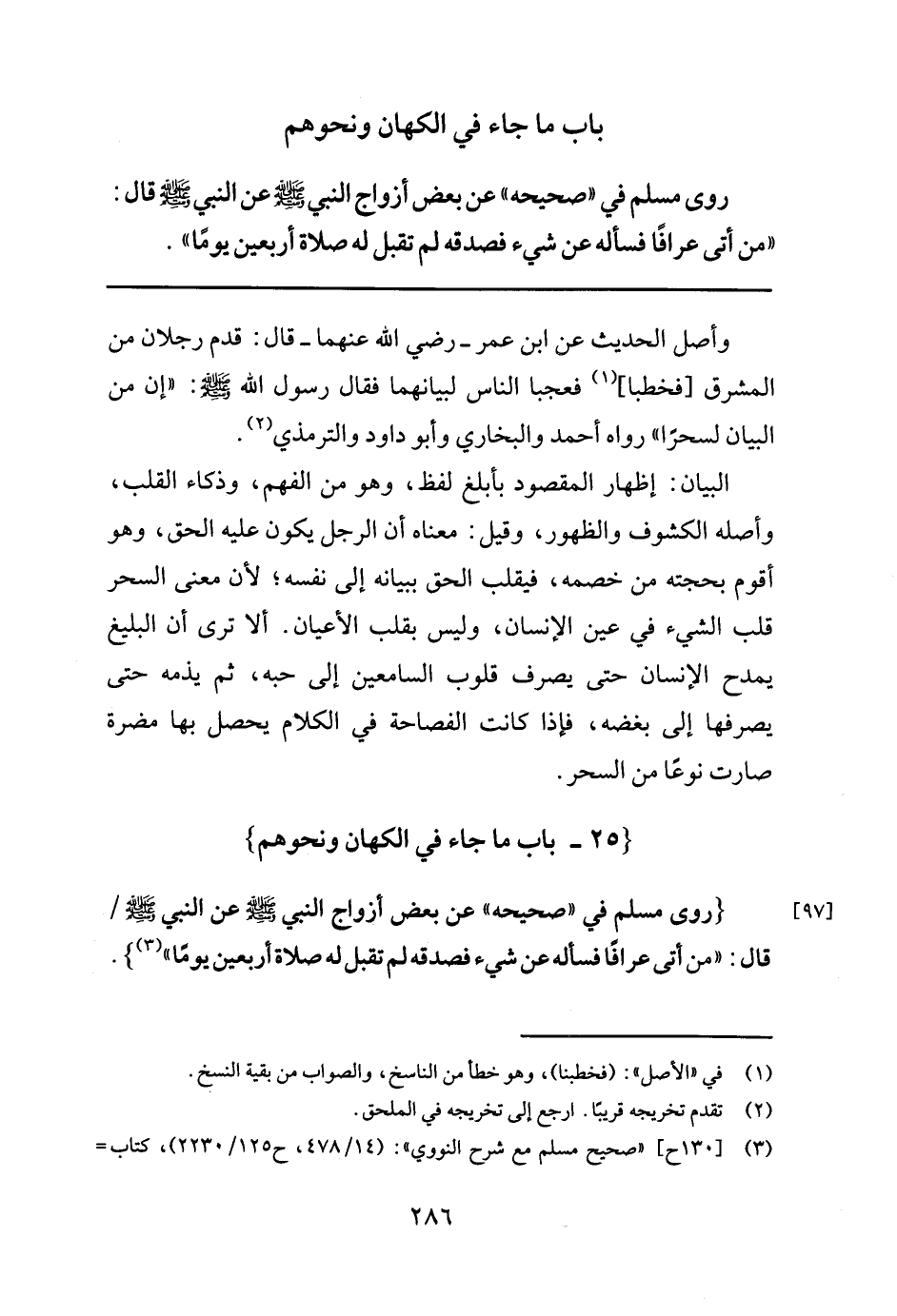 3 [130 ح] "صحيح مسلم مع شرح النووي": (14/ 478, ح 125/ 2230) , كتاب السلام, باب تحريم الكهانة وإتيان الكهان دون قوله: (فصدقه) . وانظره بنصه الذي ذكره المصنف في"مسند الإمام أحمد": (5/ 308) . انظر بقية تخريجه في الملحق.