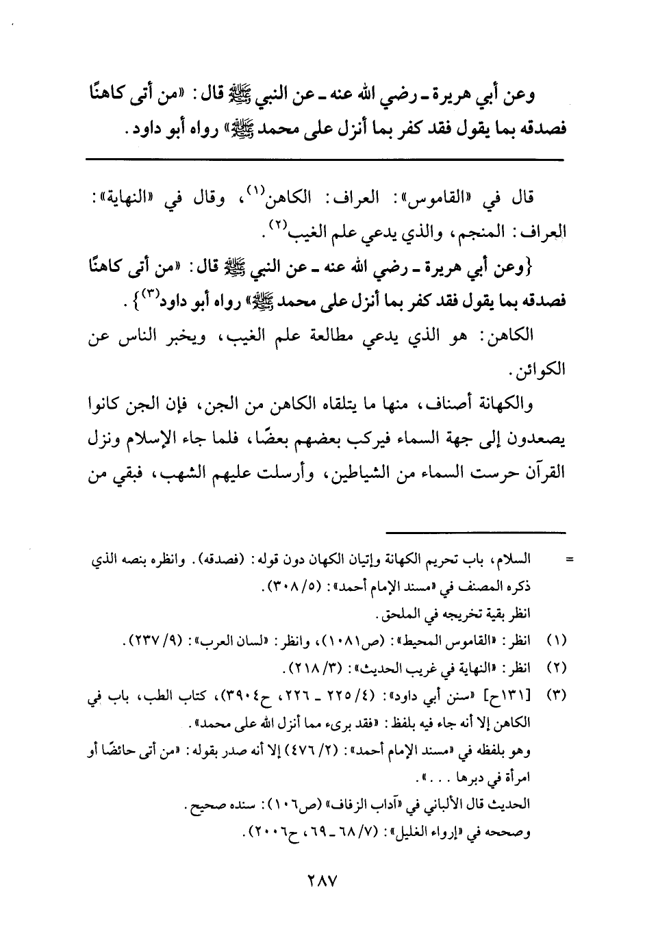 وعن أبي هريرة رضي الله عنه عن النبي صلى الله عليه وسلم قال: " من أتى كاهنا فصدقه بما يقول فقد كفر بما أنزل على محمد صلى الله عليه وسلم " رواه أبو داود.