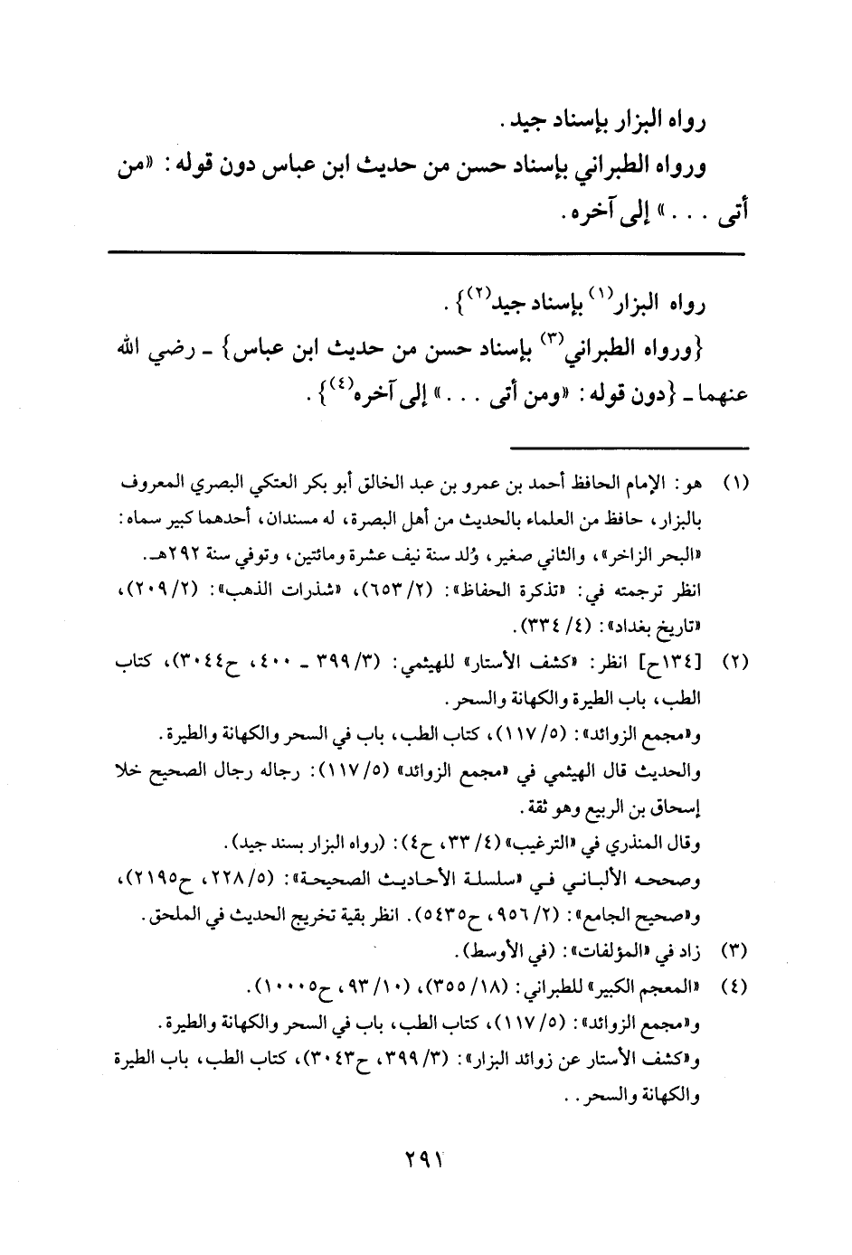 2 [134 ح] انظر:"كشف الأستار"للهيثمي: (3/ 399- 400, ح 3044) , كتاب الطب, باب الطيرة والكهانة والسحر. و"مجمع الزوائد": (5/ 117) , كتاب الطب, باب في السحر والكهانة والطيرة. والحديث قال الهيثمي في"مجمع الزوائد" (5/ 117) : رجاله رجال الصحيح خلا إسحاق بن الربيع وهو ثقة. وقال المنذري في"الترغيب" (4/ 33, ح 4) : (رواه البزار بسند جيد) . وصححه الألباني في"سلسلة الأحاديث الصحيحة": (5/ 228, ح 2195) , و"صحيح الجامع": (2/ 956, ح 5435) . انظر بقية تخريج الحديث في الملحق.