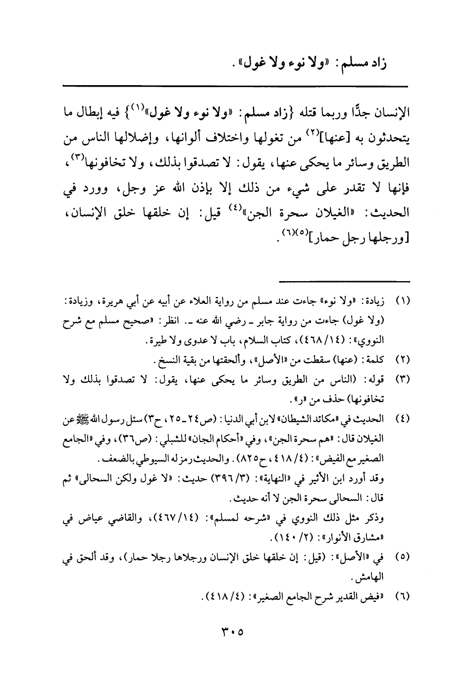 الإنسان جدا وربما قتله {زاد مسلم:" ولا نوء ولا غول 1"} فيه إبطال ما يتحدثون به [عنها] 2 من تغولها واختلاف ألوانها، وإضلالها الناس من الطريق وسائر ما يحكى عنها، يقول: لا تصدقوا بذلك، ولا تخافونها3 فإنها لا تقدر على شيء من ذلك إلا بإذن الله عز وجل وورد في الحديث: "الغيلان سحرة الجن4") قيل: إن خلقها خلق الإنسان، [ورجلها رجل حمار] 5.