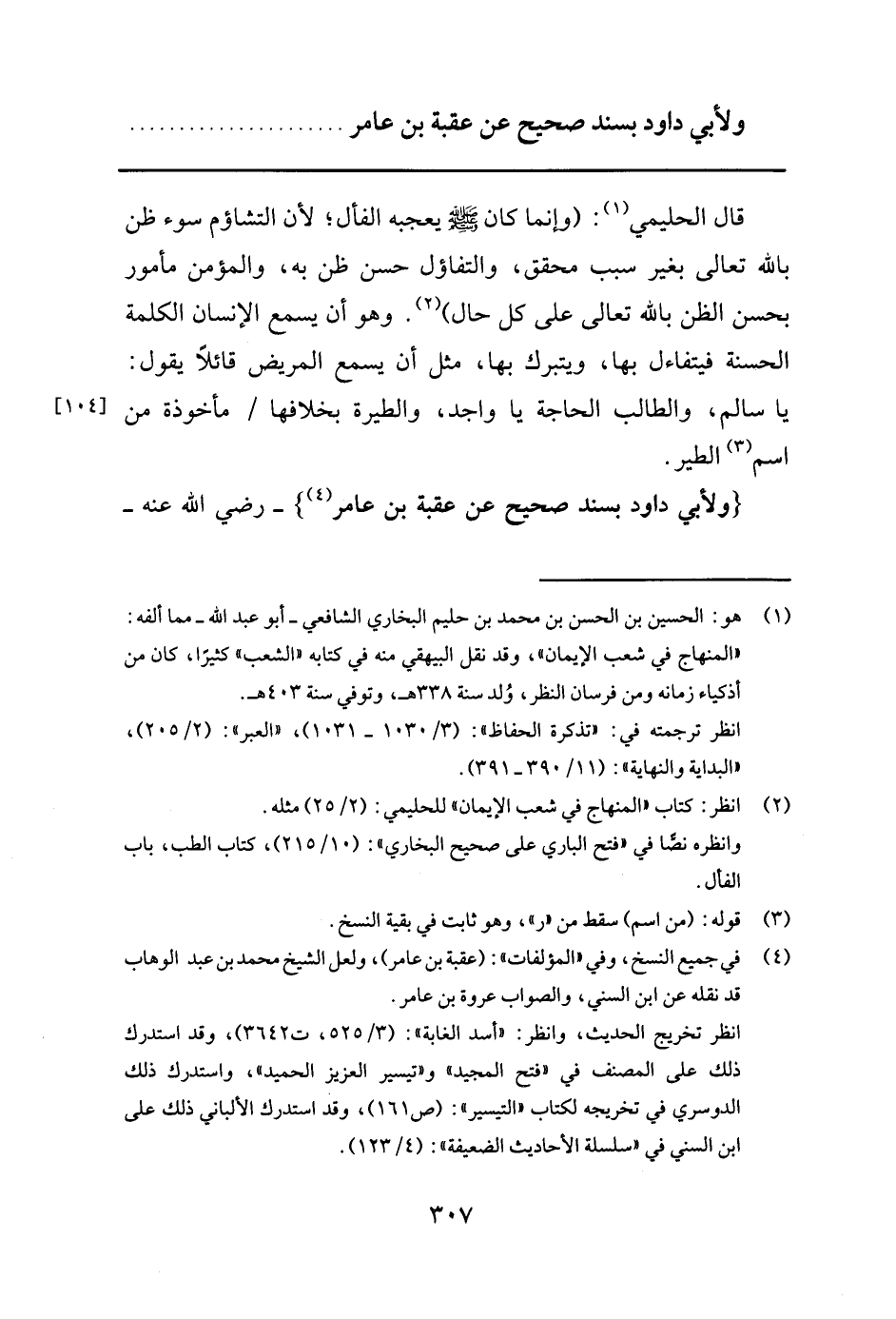 2 انظر: كتاب"المنهاج في شعب الإيمان"للحليمي: (2 / 25) مثله. وانظره نصا في"فتح الباري على صحيح البخاري": (10 / 215) , كتاب الطب, باب الفأل.