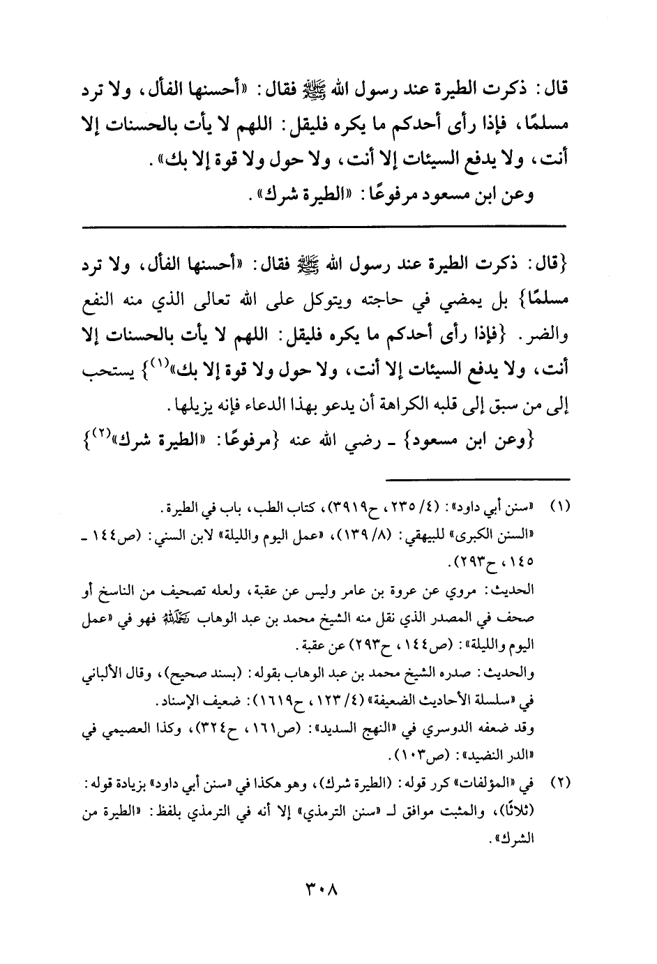 1"سنن أبي داود: (4 / 235, ح 3919) , كتاب الطب, باب في الطيرة."السنن الكبرى"للبيهقي: (8 / 139) ,"عمل اليوم والليلة"لابن السني: (ص 144- 145, ح 293) . الحديث: مروي عن عروة بن عامر وليس عن عقبة, ولعله تصحيف من الناسخ أو صحف في المصدر الذي نقل منه الشيخ محمد بن عبد الوهاب رحمه الله فهو في"عمل اليوم والليلة": (ص 144, ح 293) عن عقبة. والحديث: صدره الشيخ محمد بن عبد الوهاب بقوله: (بسند صحيح) , وقال الألباني في"سلسلة الأحاديث الضعيفة" (4 / 123, ح 1619) : ضعيف الإسناد. وقد ضعفه الدوسري في"النهج السديد": (ص 161, ح 324) , وكذا العصيمي في"الدر النضيد": (ص 103) .
