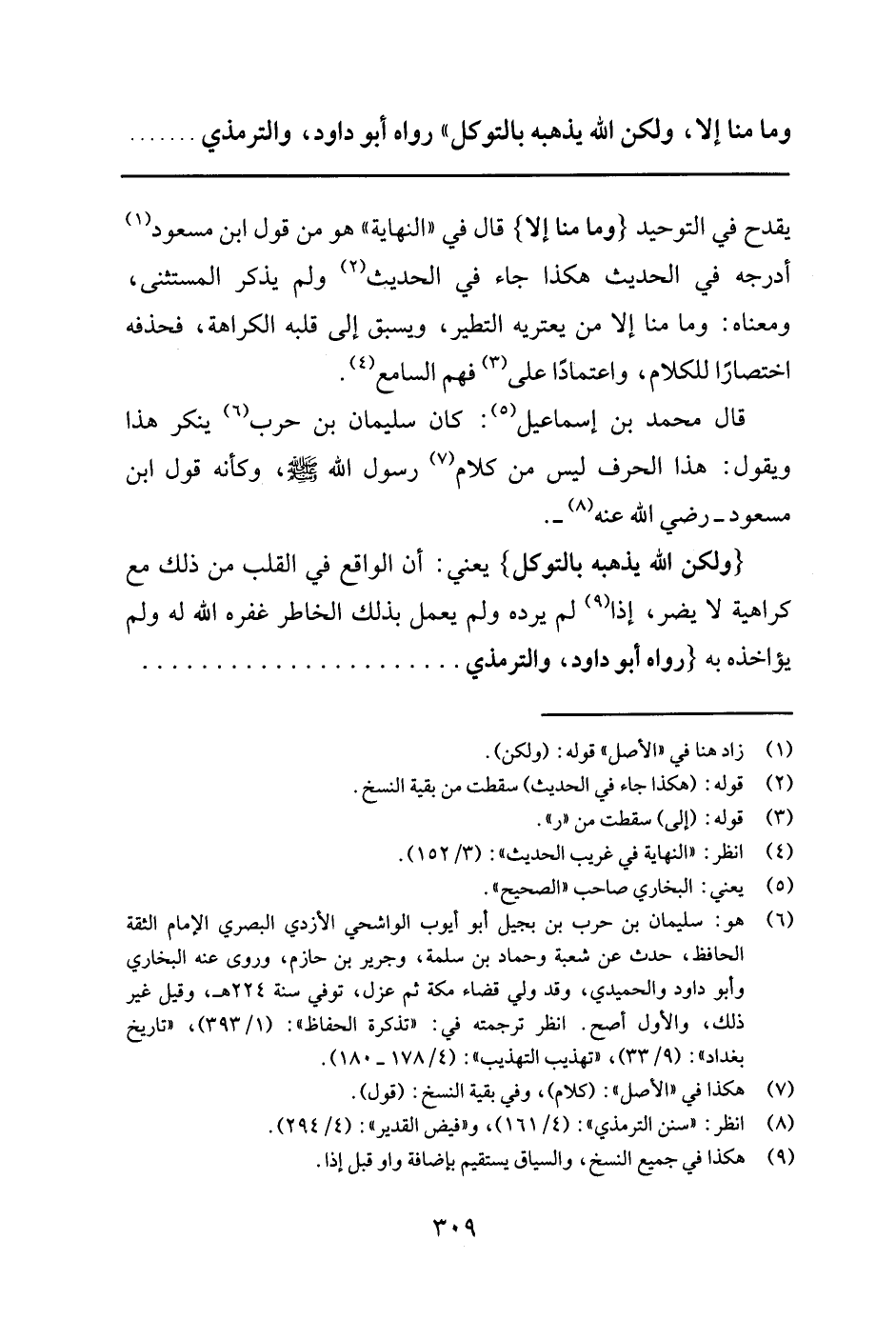 قال محمد بن إسماعيل5 كان سليمان بن حرب6 ينكر هذا ويقول: هذا الحرف ليس من كلام7 رسول الله صلى الله عليه وسلم وكأنه قول ابن مسعود- 8 -. {ولكن الله يذهبه بالتوكل} يعني: أن الواقع في القلب من ذلك مع كراهية لا يضر، إذا9 لم يرده ولم يعمل بذلك الخاطر غفره الله له ولم يؤاخذه به (رواه أبو داود، والترمذي