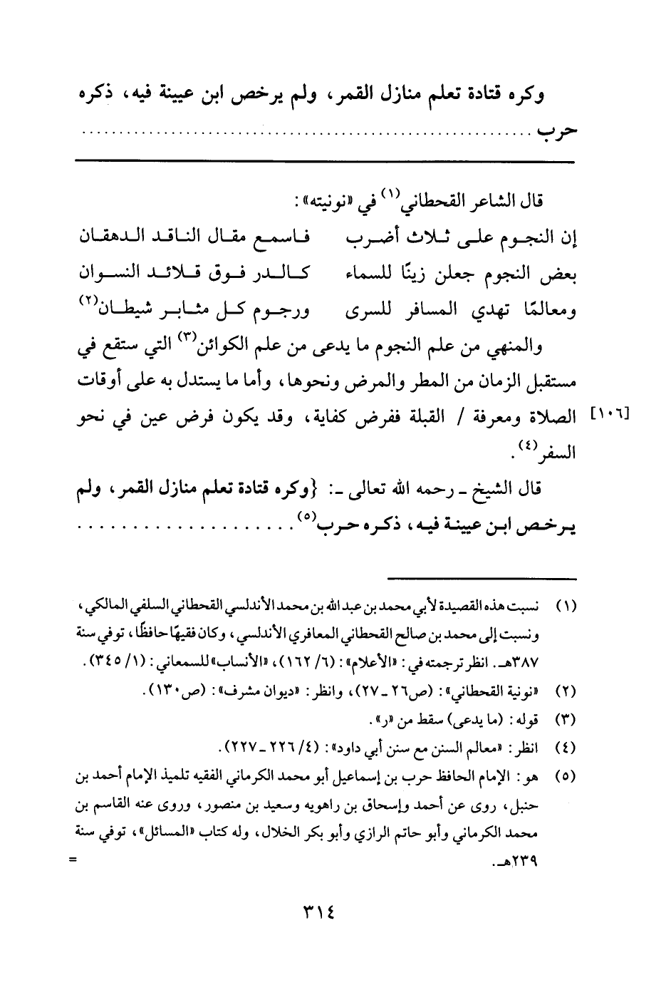 قال الشيخ- رحمه الله تعالى-: {وكره قتادة تعلم منازل القمر، ولم يرخص ابن عيينة فيه، ذكره حرب5