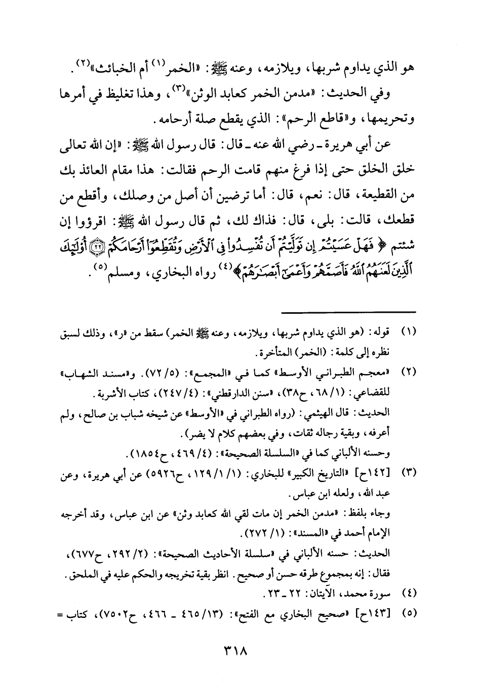 وفي الحديث: " مدمن الخمر كعابد الوثن 3") وهذا تغليظ في أمرها وتحريمها، و"قاطع الرحم": الذي يقطع صلة أرحامه.