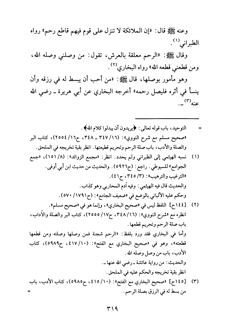 2 [144 ح] اللفظ ليس في"صحيح البخاري", وإنما هو في"صحيح مسلم". انظره مع"شرح النووي": (16 / 348, ح 17 / 2555) , كتاب البر والصلة والآداب, باب صلة الرحم وتحريم قطعها. وأما في البخاري فقد ورد بلفظ:"الرحم شجنة فمن وصلها وصلته ومن قطعها قطعته", وهو في"صحيح البخاري مع الفتح": (10 / 417, ح 5989) , كتاب الأدب, باب من وصل وصله الله. والحديث: من رو، الآية عائشة- رضي الله عنها-. انظر بقية تخريجه والحكم عليه في الملحق.