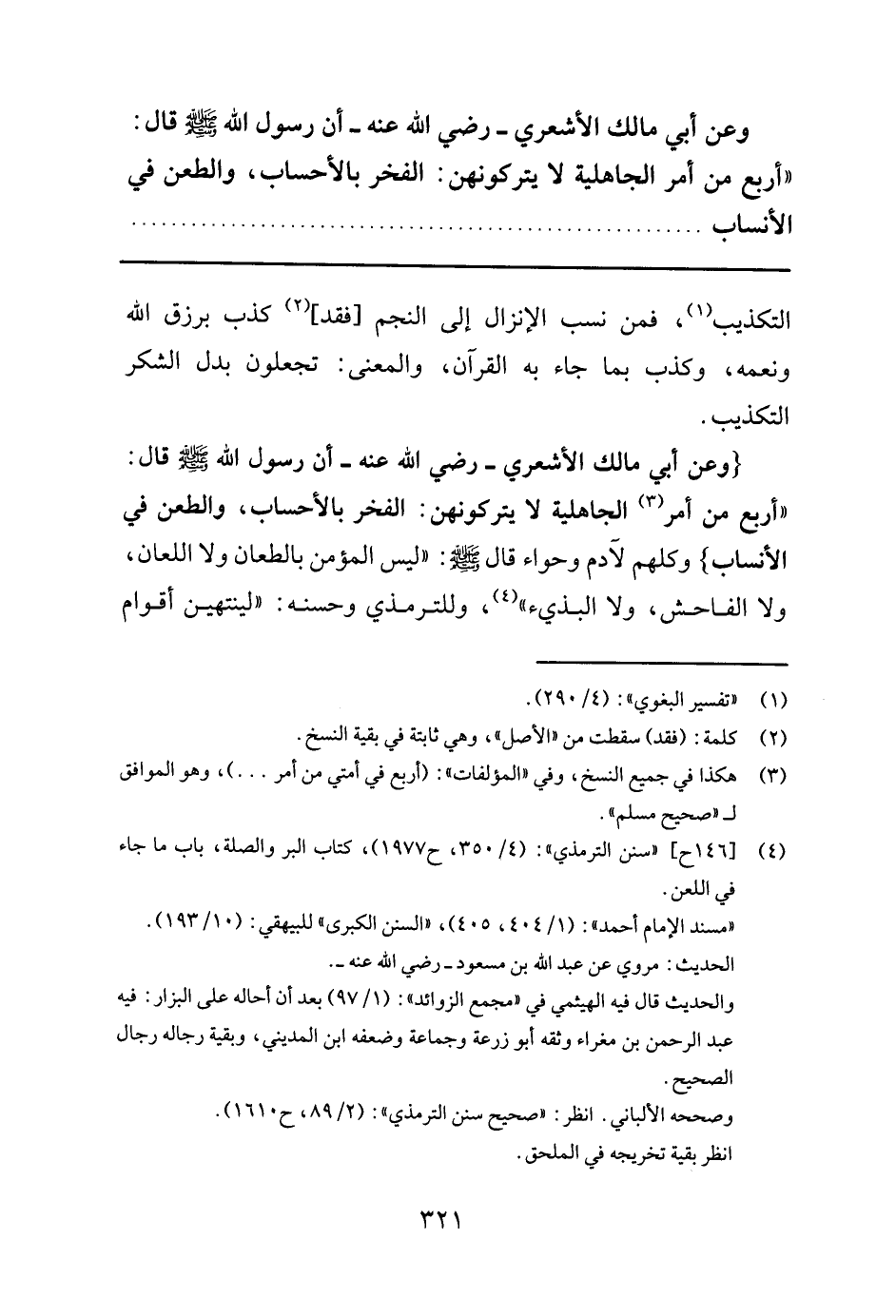وعن أبي مالك الأشعري- رضي الله عنه- أن رسول الله صلى الله عليه وسلم قال: " أربع من أمر الجاهلية لا يتركونهن: الفخر بالأحساب، والطعن في الأنساب