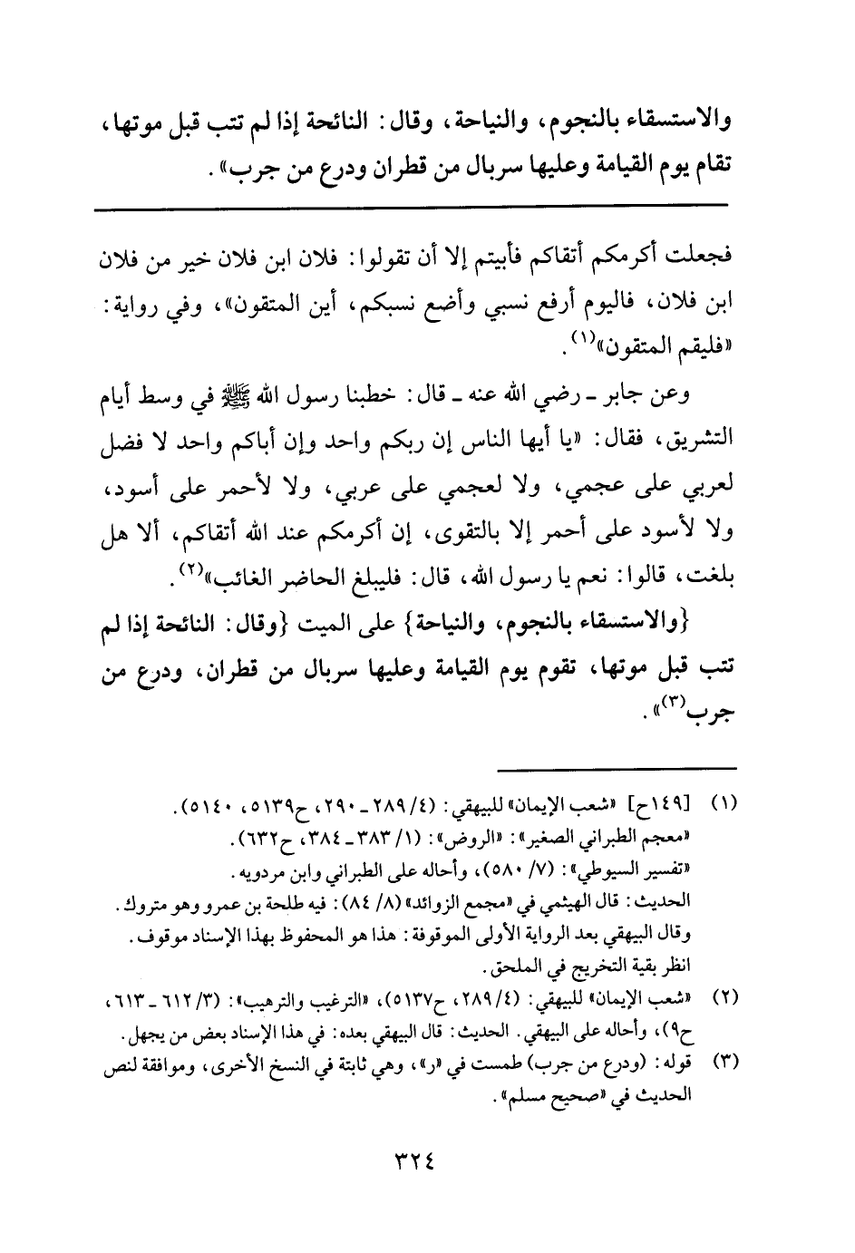 وعن جابر- رضي الله عنه- قال: "خطبنا رسول الله صلى الله عليه وسلم في وسط أيام التشريق، فقال: يا أيها الناس إن ربكم واحد وإن أباكم واحد لا فضل لعربي على عجمي، ولا لعجمي على عربي، ولا لأحمر على أسود، ولا لأسود على أحمر إلا بالتقوى، إن أكرمكم عند الله أتقاكم، ألا هل بلغت، قالوا: نعم يا رسول الله، قال: فليبلغ الحاضر الغائب "2