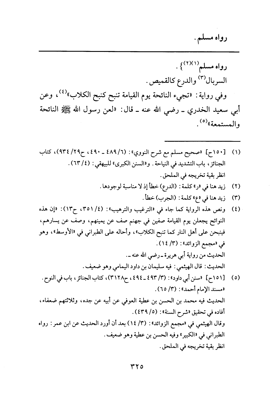 1 [150 ح] "صحيح مسلم مع شرح النووي": (6 / 489- 490, ح 29 / 934) , كتاب الجنائز, باب التشديد في النياحة. و"السنن الكبرى"للبيهقي: (4 / 63) . انظر بقية تخريجه في الملحق.