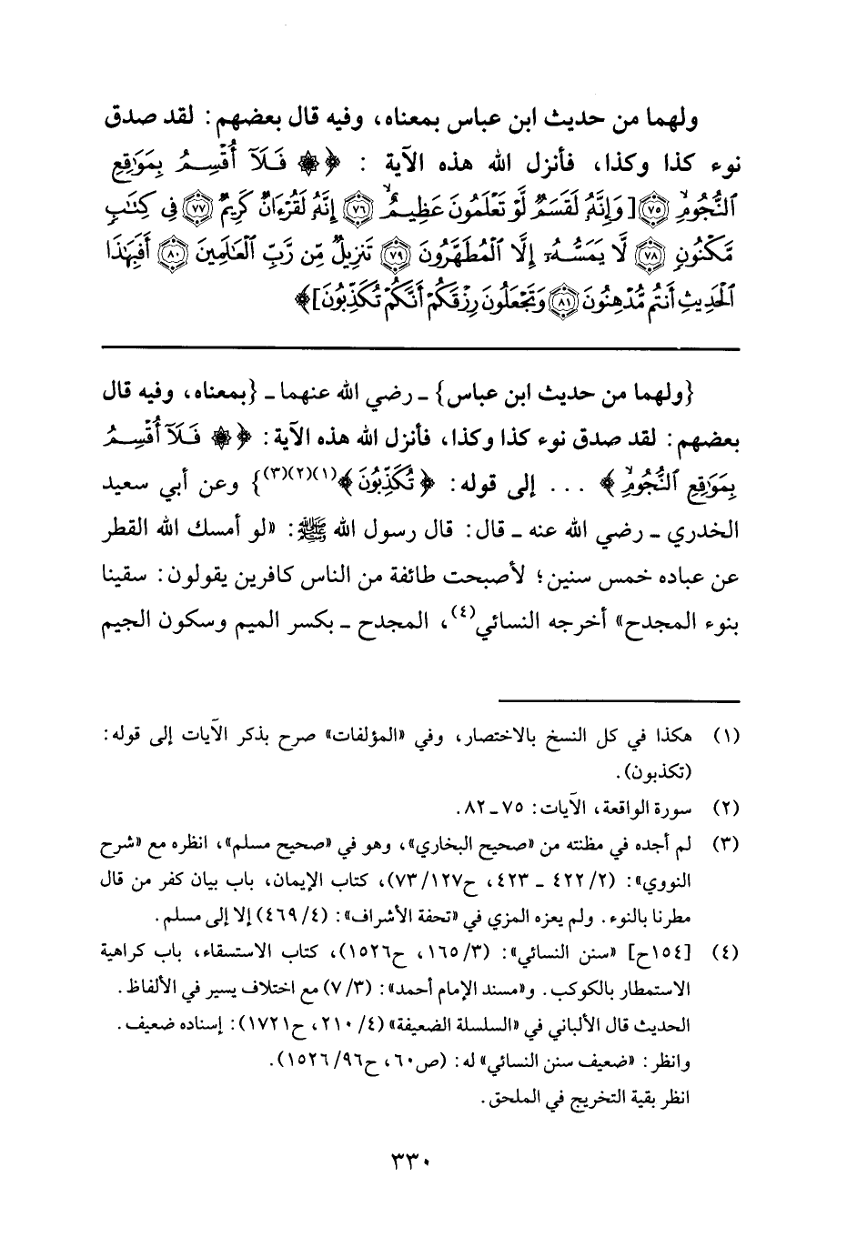 ولهما من حديث ابن عباس بمعناه، وفيه قال بعضهم: لقد صدق نوء كذا وكذا، فأنزل الله هذه الآية: {فَلا أُقْسِمُ بِمَوَاقِعِ النُّجُومِ وَإِنَّهُ لَقَسَمٌ لَوْ تَعْلَمُونَ عَظِيمٌ إِنَّهُ لَقُرْآنٌ كَرِيمٌ فِي كِتَابٍ مَكْنُونٍ لا يَمَسُّهُ إِلاَّ الْمُطَهَّرُونَ تَنْزِيلٌ مِنْ رَبِّ الْعَالَمِينَ أَفَبِهَذَا الْحَدِيثِ أَنْتُمْ مُدْهِنُونَ وَتَجْعَلُونَ رِزْقَكُمْ أَنَّكُمْ تُكَذِّبُونَ}