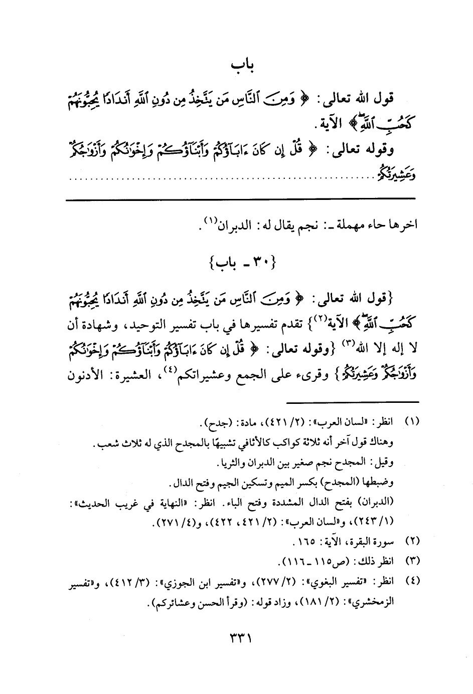 {باب) قول الله تعالى {وَمِنَ النَّاسِ مَنْ يَتَّخِذُ مِنْ دُونِ اللَّهِ أَنْدَاداً يُحِبُّونَهُمْ كَحُبِّ اللَّهِ} 2 الآية تقدم تفسيرها في باب تفسير التوحيد، وشهادة أن لا إله إلا الله3 وقوله تعالى: {قُلْ إِنْ كَانَ آبَاؤُكُمْ وَأَبْنَاؤُكُمْ وَإِخْوَانُكُمْ وَأَزْوَاجُكُمْ وَعَشِيرَتُكُمْ} وقرئ على الجمع وعشيراتكم،4 العشيرة: الأدنون