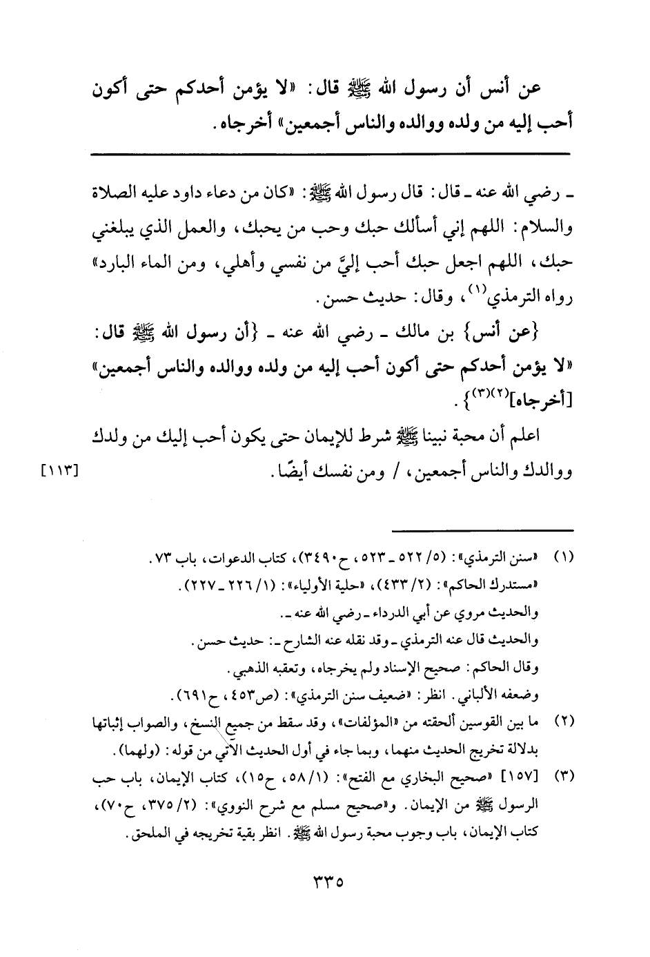 3 [157] "صحيح البخاري مع الفتح": (1 / 58, ح 15) , كتاب الإيمان, باب حب الرسول صلى الله عليه وسلم من الإيمان. و"صحيح مسلم مع شرح النووي": (2 / 375, ح 70) , كتاب الإيمان, باب وجوب محبة رسول الله صلى الله عليه وسلم. انظر بقية تخريجه في الملحق.