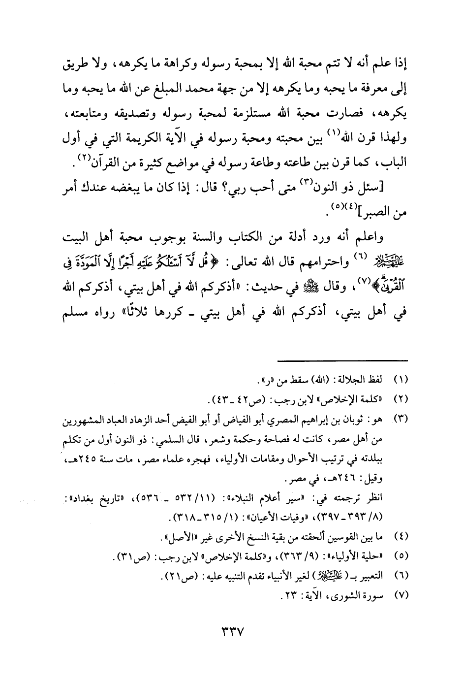 واعلم أنه ورد أدلة من الكتاب والسنة بوجوب محبة أهل البيت عليهم السلام6 واحترامهم قال الله تعالى: {قُلْ لا أَسْأَلُكُمْ عَلَيْهِ أَجْراً إِلاَّ الْمَوَدَّةَ فِي الْقُرْبَى} 7 وقال صلى الله عليه وسلم في حديث: "أذكركم الله في أهل بيتي، أذكركم الله في أهل بيتي، أذكركم الله في أهل بيتي- كررها ثلاثا " رواه مسلم.