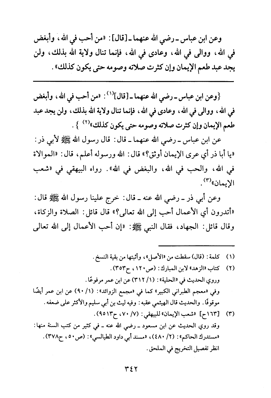 عن ابن عباس- رضي الله عنهما- قال: قال رسول الله صلى الله عليه وسلم لأبي ذر: "يا أبا ذر أي عرى الإيمان أوثق؟ قال: الله ورسوله أعلم، قال: الموالاة في الله، والحب في الله، والبغض في الله " رواه البيهقي في"شعب الإيمان"3.