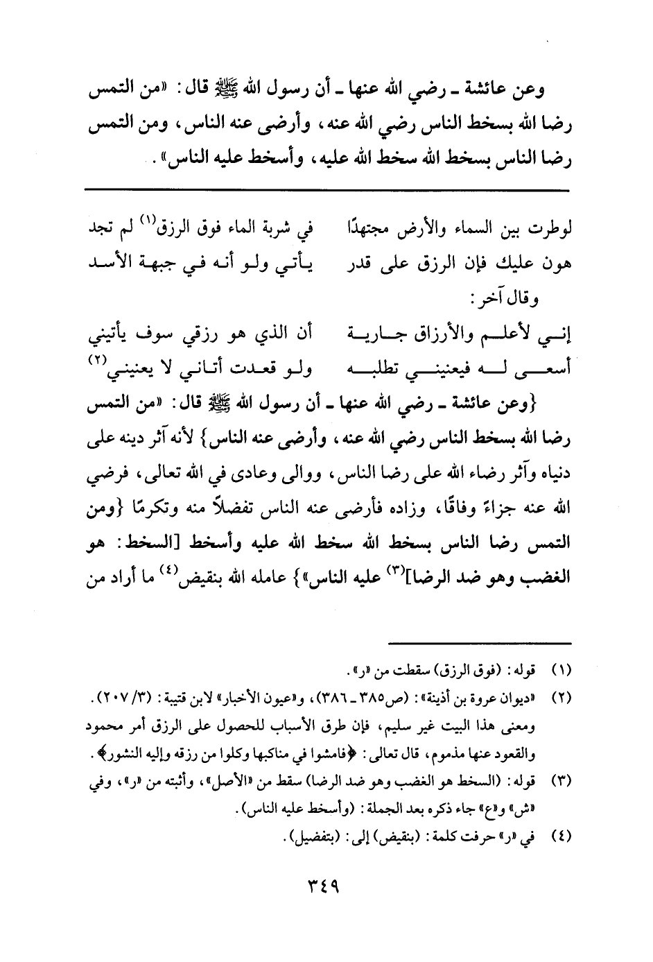 2"ديوان عروة بن أذينة": (ص 385- 386) , و"عيون الأخبار"لابن قتيبة: (3 / 207) . ومعنى هذا البيت غير سليم, فإن طرق الأسباب للحصول على الرزق أمر محمود والقعود عنها مذموم, قال تعالى: {فَامْشُوا فِي مَنَاكِبِهَا وَكُلُوا مِنْ رِزْقِهِ وَإِلَيْهِ النُّشُورُ} (الملك: من الآية15) .