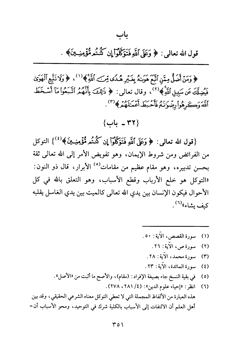 6 انظر:"إحياء علوم الدين": (4 / 281, 278) . هذه العبارة من الألفاظ المجملة التي لا تعطي التوكل معناه الشرعي الحقيقي, وقد بين أهل العلم أن الالتفات إلى الأسباب بالكلية شرك في التوحيد, ومحو الأسباب أن تكون أسبابا نقص في العقل, والإعراض عن الأسباب المأمور بها قدح في الشرع. انظر:"مجموع الفتاوى"لابن تيمية: (8 / 528) . وبينوا أن تحقيق التوكل لا ينافي السعي في الأسباب التي قدر الله سبحانه المقدورات بها وجرت سنته في خلقه بها. انظر:"جامع العلوم والحكم"لابن رجب: (ص 498) . وأما تشبيه المتعلق بالله في كل الأحوال بالميت بين يدي الغاسل فهو مقتبس مما يعبر به الصوفية عن حال المريدين مع شيوخهم. ولا وجه للتشبيهين.