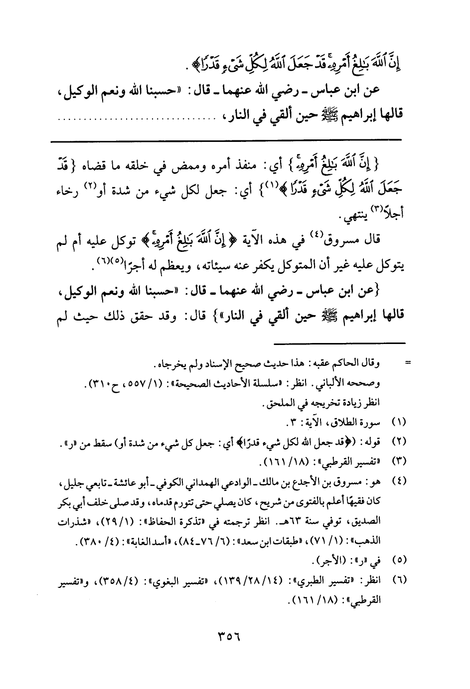 عن ابن عباس- رضي الله عنهما- قال: "حسبنا الله ونعم الوكيل، قالها إبراهيم صلى الله عليه وسلم حين ألقي في النار