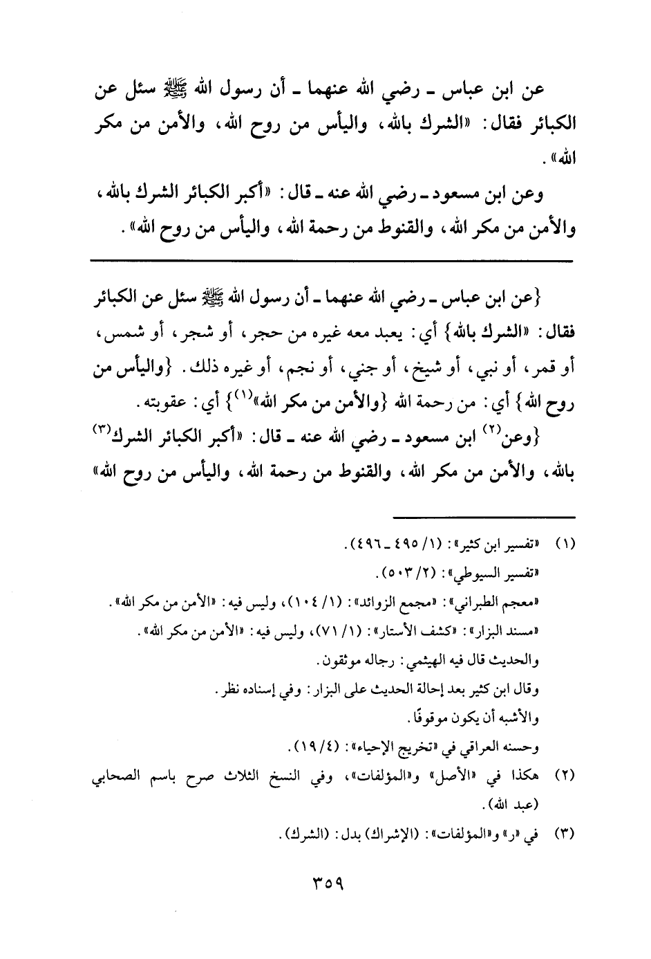 عن ابن عباس- رضي الله عنهما- أن رسول الله صلى الله عليه وسلم "سئل عن الكبائر فقال: الشرك بالله، واليأس من روح الله، والأمن من مكر الله ".