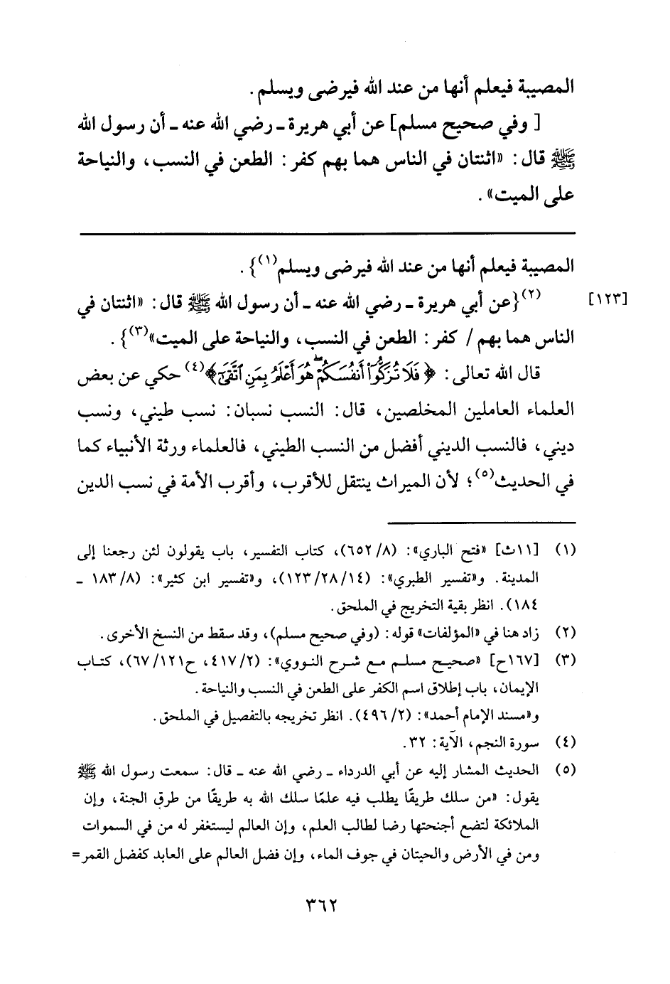 قال الله تعالى: {فَلا تُزَكُّوا أَنْفُسَكُمْ هُوَ أَعْلَمُ بِمَنِ اتَّقَى} 4 حكي عن بعض العلماء العاملين المخلصين، قال: النسب نسبان: نسب طيني، ونسب ديني، فالنسب الديني أفضل من النسب الطيني، فالعلماء ورثة الأنبياء كما في الحديث5؟ لأن الميراث ينتقل للأقرب، وأقرب الأمة في نسب الدين