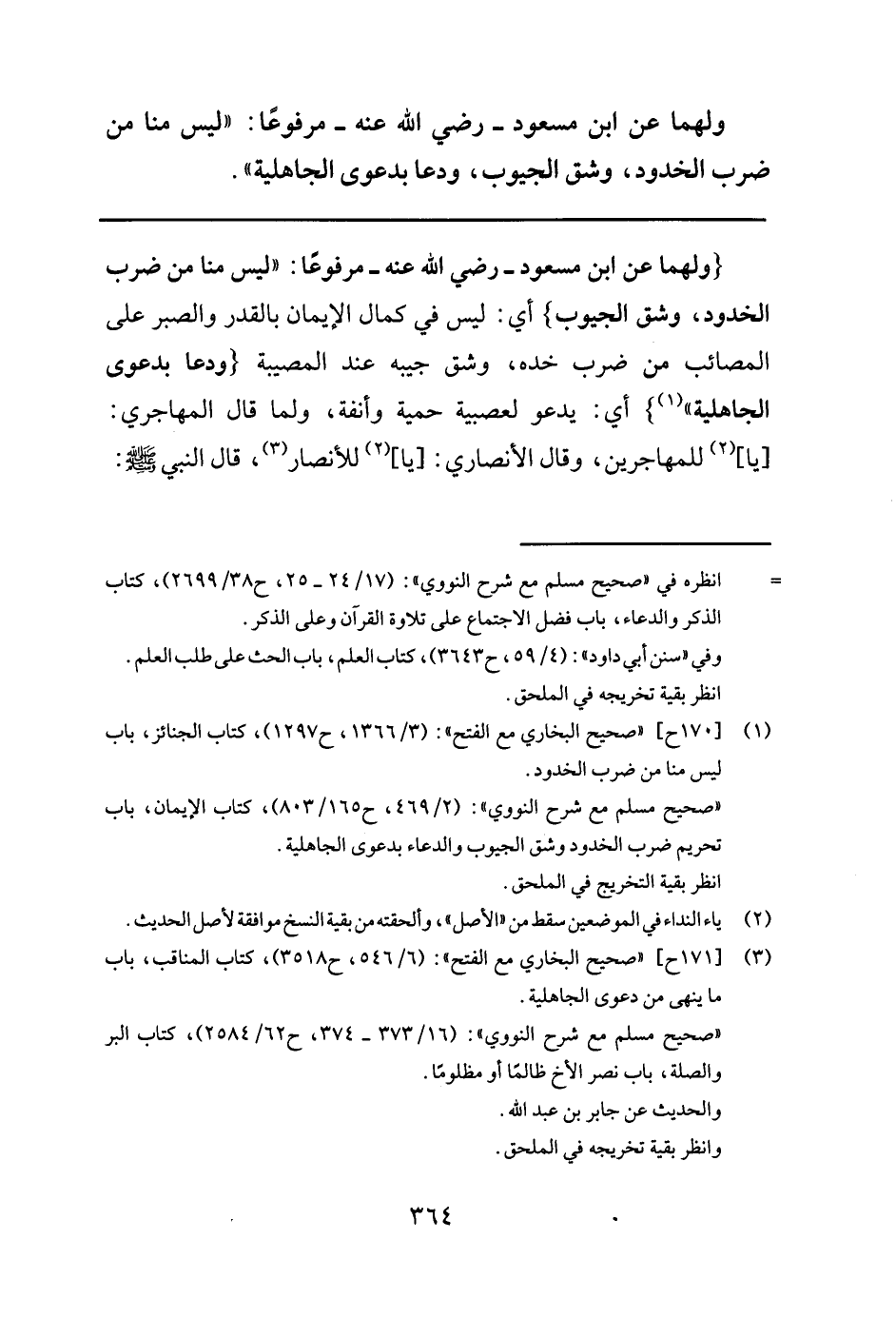 1 [170 ح] "صحيح البخاري مع الفتح": (3 / 1366, ح 1297) , كتاب الجنائز, باب ليس منا من ضرب الخدود."صحيح مسلم مع شرح النووي": (2 / 469, ح 165 / 803) , كتاب الإيمان, باب تحريم ضرب الخدود وشق الجيوب والدعاء بدعوى الجاهلية. انظر بقية التخريج في الملحق.