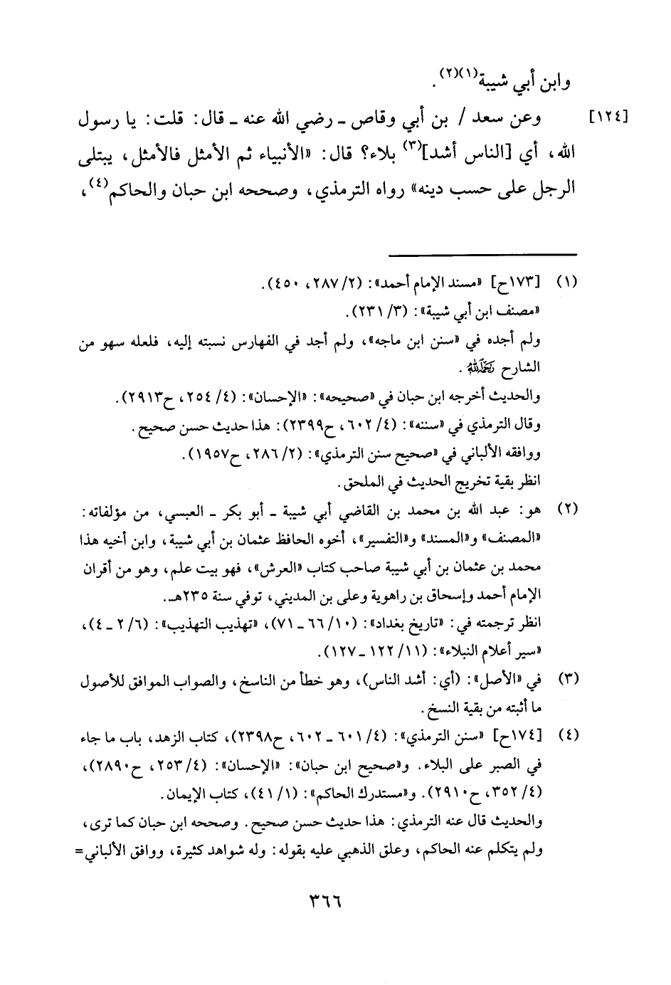 4 [174 ح] "سنن الترمذي": (4 / 601- 602, ح 2398) , كتاب الزهد, باب ما جاء في الصبر على البلاء. و"صحيح ابن حبان":"الإحسان": (4 / 253, ح 2890) , (4 / 352, ح 2910) . و"مستدرك الحاكم": (1 / 41) , كتاب الإيمان. والحديث قال عنه الترمذي: هذا حديث حسن صحيح. وصححه ابن حبان كما ترى, ولم يتكلم عنه الحاكم, وعلق الذهبي عليه بقوله: وله شواهد كثيرة, ووافق الألباني الترمذي فقال في"صحيح سنن الترمذي" (2 / 286, ح 1956) : حسن صحيح, وانظر:"السلسلة الصحيحة": (1 / 225, ح 143) . انظر بقية تخريج الحديث في الملحق.