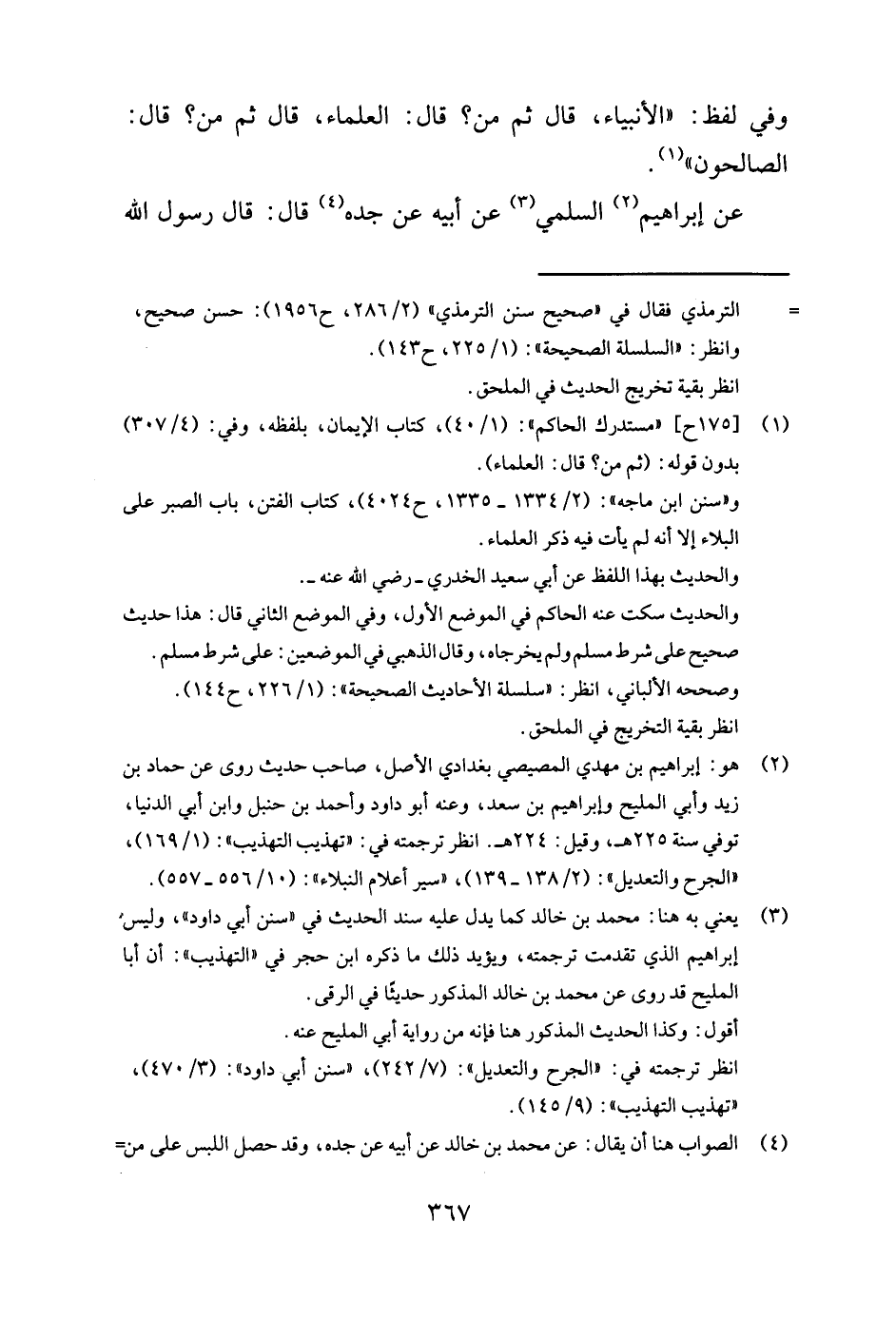 1 [175 ح] "مستدرك الحاكم": (1 / 40) , كتاب الإيمان, بلفظه, وفي: (4 / 307) بدون قوله: (ثم من؟ قال: العلماء) . و"سنن ابن ماجه": (2 / 1334- 1335, ح 4024) , كتاب الفتن, باب الصبر على البلاء إلا أنه لم يأت فيه ذكر العلماء. والحديث بهذا اللفظ عن أبي سعيد الخدري- رضي الله عنه-. والحديث سكت عنه الحاكم في الموضع الأول, وفي الموضع الثاني قال: هذا حديث صحيح على شرط مسلم ولم يخرجاه, وقال الذهبي في الموضعين: على شرط مسلم. وصححه الألباني, انظر:"سلسلة الأحاديث الصحيحة": (1 / 226, ح 144) . انظر بقية التخريج في الملحق.