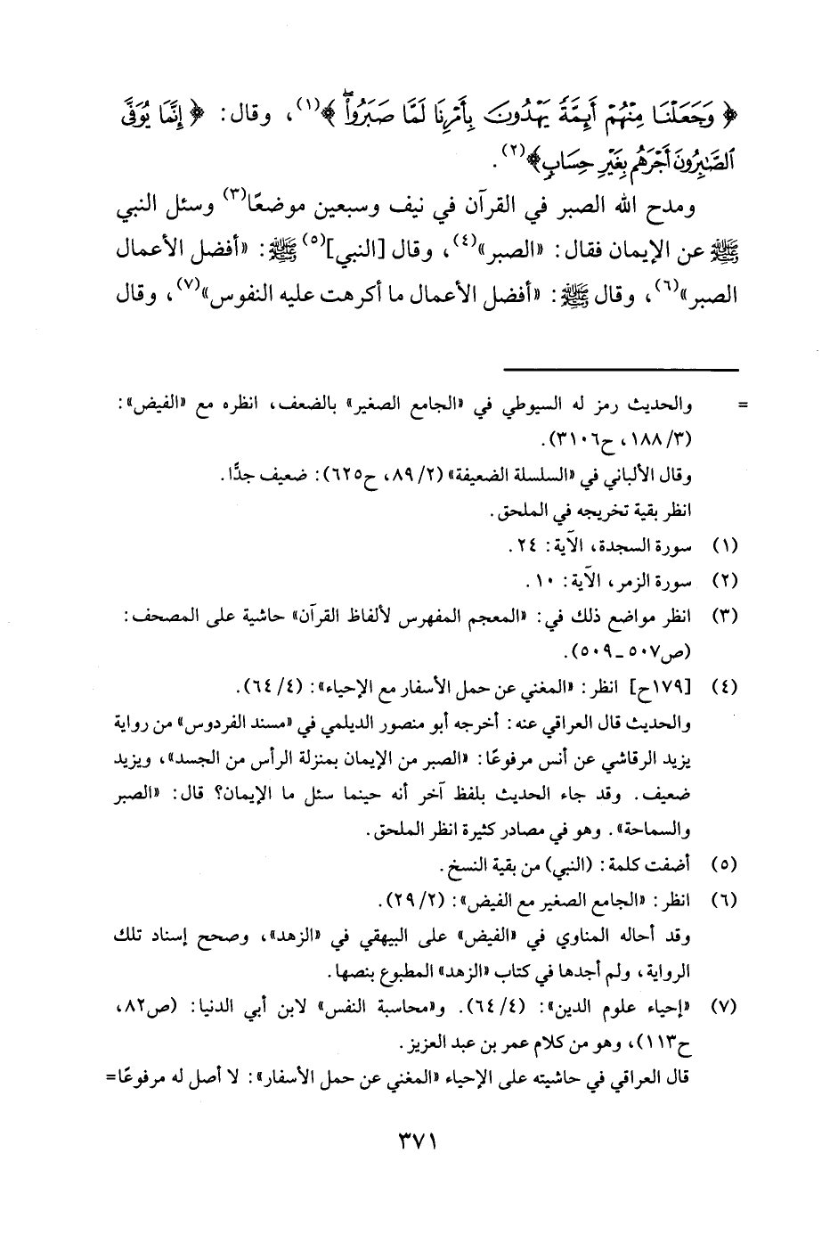 ومدح الله الصبر في القرآن في نيف وسبعين موضعا3 "وسئل النبي صلى الله عليه وسلم عن الإيمان فقال: الصبر4") وقال [النبي] 5 صلى الله عليه وسلم " أفضل الأعمال الصبر "6 وقال صلى الله عليه وسلم "أفضل الأعمال ما أكرهت عليه النفوس "7 وقال