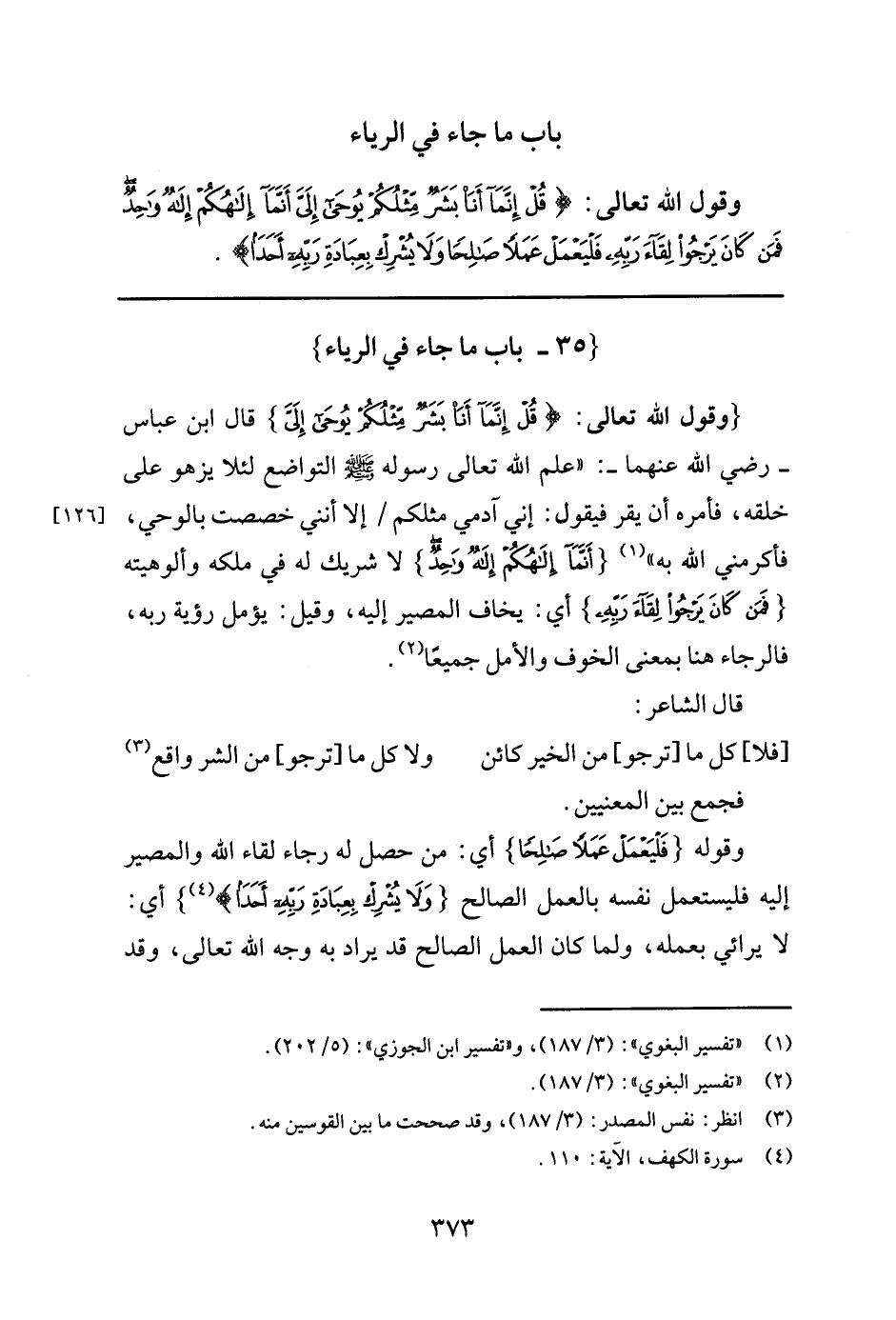 وقول الله تعالى: {قُلْ إِنَّمَا أَنَا بَشَرٌ مِثْلُكُمْ يُوحَى إِلَيَّ أَنَّمَا إِلَهُكُمْ إِلَهٌ وَاحِدٌ فَمَنْ كَانَ يَرْجُوا لِقَاءَ رَبِّهِ فَلْيَعْمَلْ عَمَلاً صَالِحاً وَلا يُشْرِكْ بِعِبَادَةِ رَبِّهِ أَحَداً}