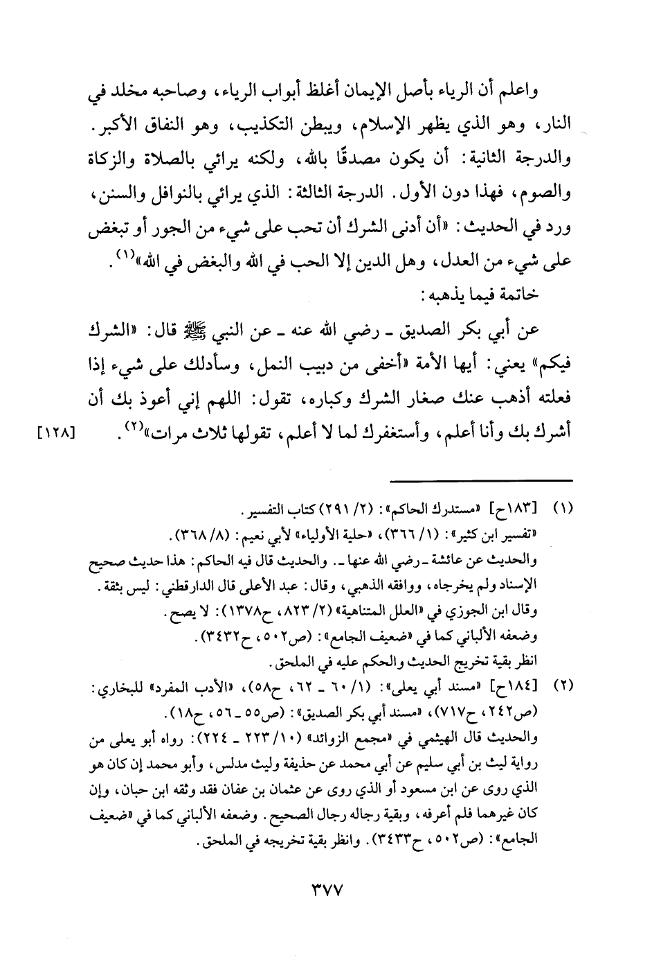 عن أبي بكر الصديق- رضي الله عنه- عن النبي صلى الله عليه وسلم قال: " الشرك فيكم يعني: أيها الأمة أخفى من دبيب النمل، وسأدلك على شيء إذا فعلته أذهب عنك صغار الشرك وكباره، تقول: اللهم إني أعوذ بك أن أشرك بك وأنا أعلم، وأستغفرك لما لا أعلم، تقولها ثلاث مرات "2