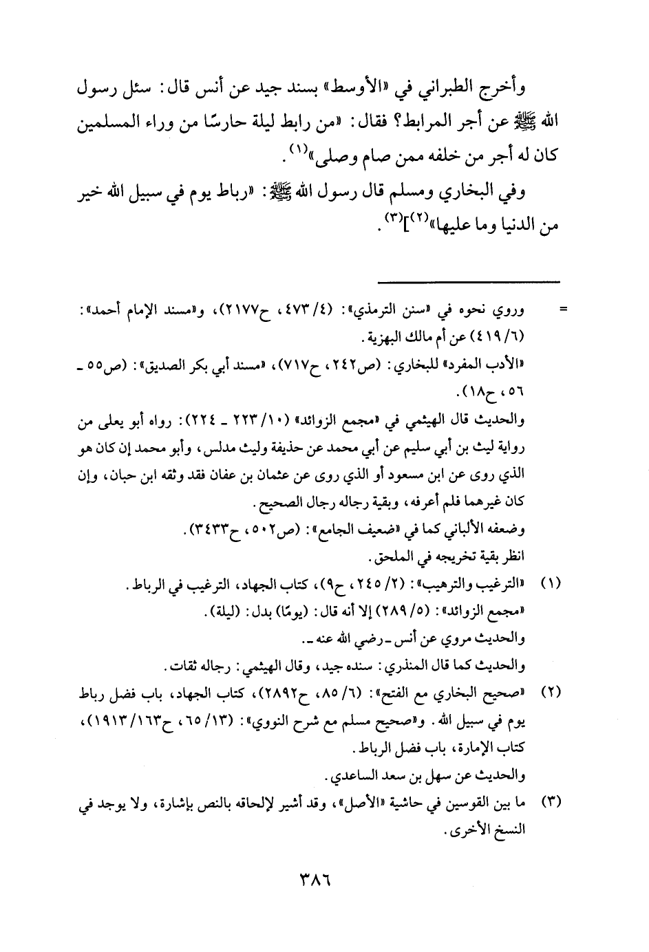 2"صحيح البخاري مع الفتح": (6 / 85, ح 2892) , كتاب الجهاد, باب فضل رباط يوم في سبيل الله. و"صحيح مسلم مع شرح النووي": (13 / 65, ح 163 / 1913) , كتاب الإمارة, باب فضل الرباط. والحديث عن سهل بن سعد الساعدي.