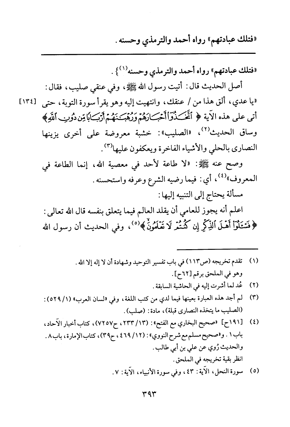 أصل الحديث قال: أتيت رسول الله صلى الله عليه وسلم وفي عنقي صليب، فقال: "يا عدي، ألق هذا من عنقك " وانتهيت إليه وهو يقرأ سورة التوبة، حتى أتى على هذه الآية {اتَّخَذُوا أَحْبَارَهُمْ وَرُهْبَانَهُمْ أَرْبَاباً مِنْ دُونِ اللَّهِ} وساق الحديث،2 "الصليب": خشبة معروضة على أخرى يزينها النصارى بالحلي والأشياء الفاخرة ويعكفون عليها.3