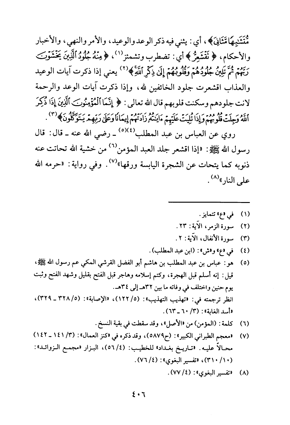 روي عن العباس بن عبد المطلب45 رضي الله عنه قال: قال رسول الله صلى الله عليه وسلم " إذا اقشعر جلد العبد المؤمن6 من خشية الله تحاتت عنه ذنوبه كما يتحات عن الشجرة اليابسة ورقها "7 وفي رواية: " حرمه الله على النار "8