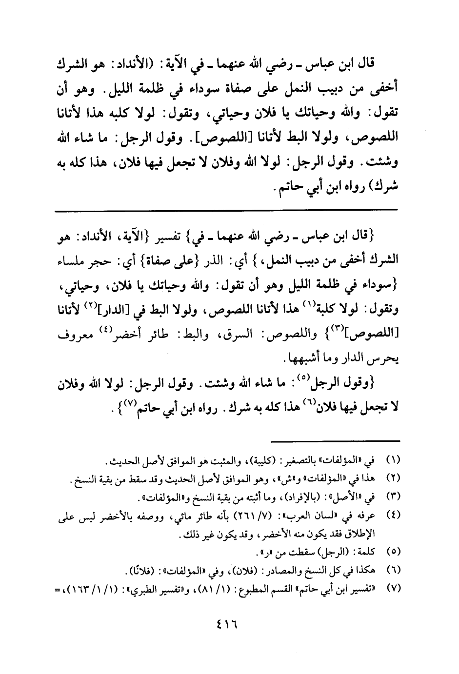 قال ابن عباس - رضي الله عنهما - في الآية: "الأنداد: هو الشرك أخفى من دبيب النمل على صفاة سوداء في ظلمة الليل. وهو أن تقول: والله وحياتك يا فلان وحياتي، وتقول: لولا كلبه هذا لأتانا اللصوص، ولولا البط لأتانا [اللصوص] . وقول الرجل: ما شاء الله وشئت. وقول الرجل: لولا الله وفلان لا تجعل فيها فلان، هذا كله به شرك" رواه ابن أبي حاتم.