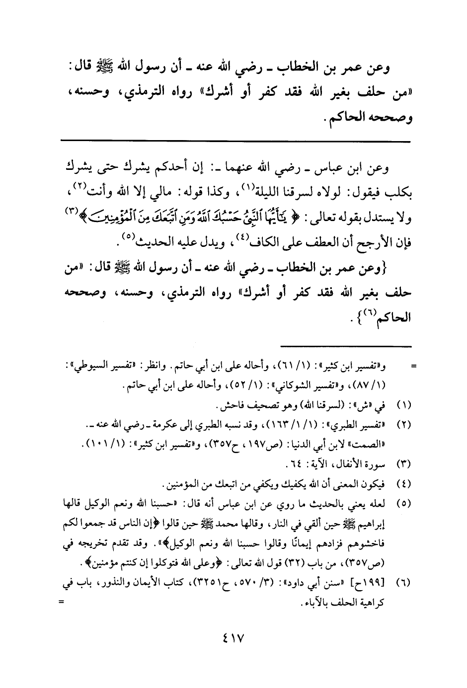 {وعن عمر بن الخطاب رضي الله عنه أن رسول الله صلى الله عليه وسلم قال: " من حلف بغير الله فقد كفر أو أشرك " رواه الترمذي، وحسنه، وصححه الحاكم6} .