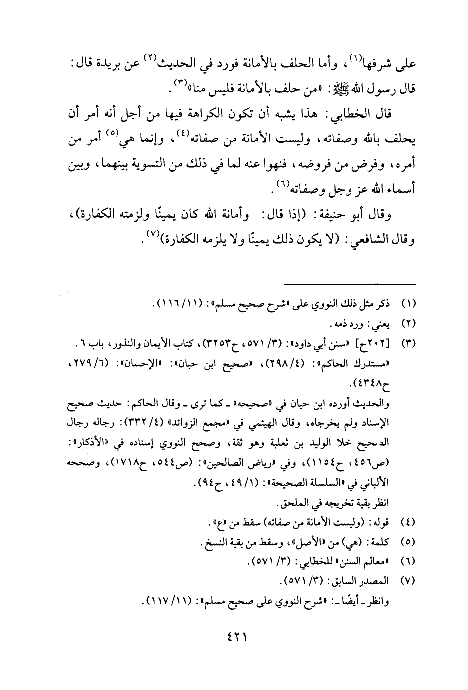 قال الخطابي: هذا يشبه أن تكون الكراهة فيها من أجل أنه أمر أن يحلف بالله وصفاته، وليست الأمانة من صفاته4 وإنما هي5 أمر من أمره، وفرض من فروضه، فنهوا عنه لما في ذلك من التسوية بينهما، وبين أسماء الله عز وجل وصفاته6.