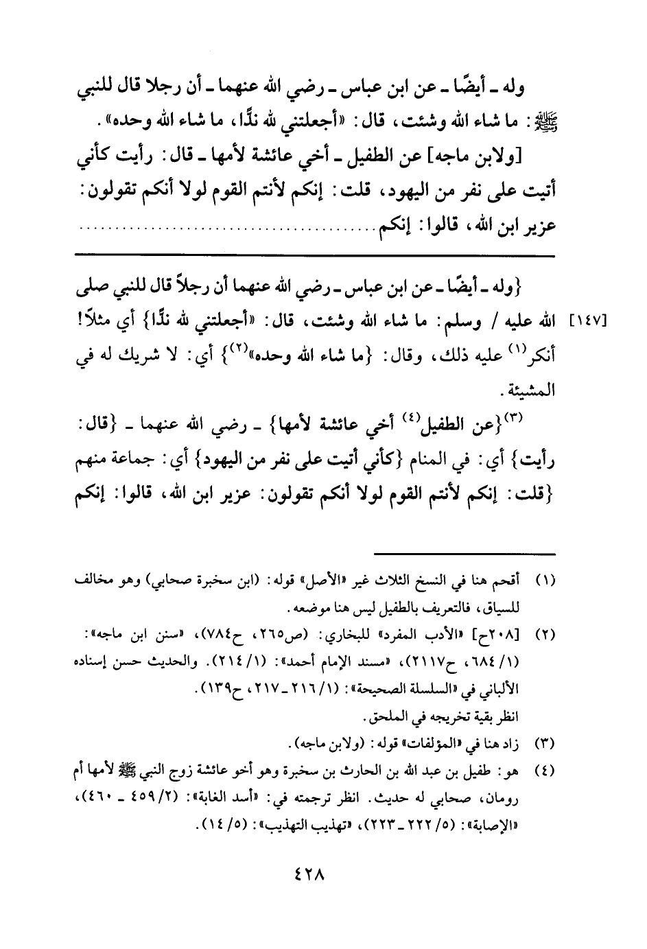 [ولابن ماجه] عن الطفيل - أخي عائشة لأمها - قال: رأيت كأني أتيت على نفر من اليهود، قلت: إنكم لأنتم القوم لولا أنكم تقولون: عزير ابن الله، قالوا: إنكم