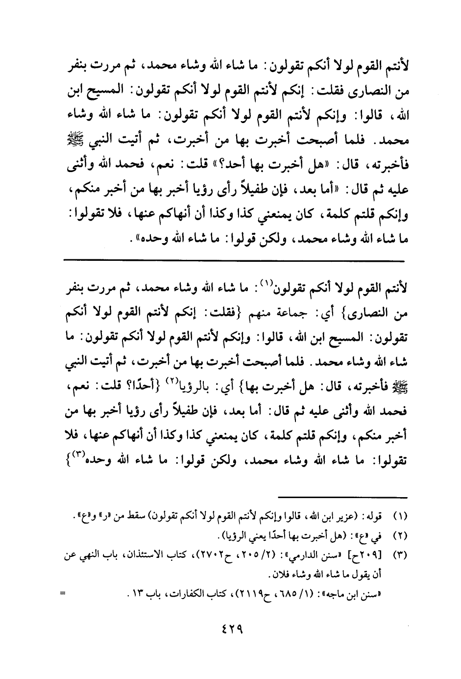 لأنتم القوم لولا أنكم تقولون: ما شاء الله وشاء محمد، ثم مررت بنفر من النصارى فقلت: إنكم لأنتم القوم-: لولا أنكم تقولون: المسيح ابن الله، قالوا: وإنكم لأنتم القوم لولا أنكم تقولون: ما شاء الله وشاء محمد.