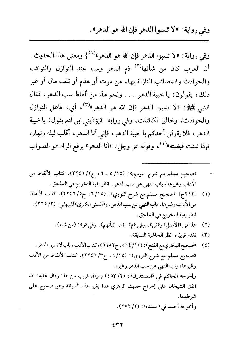 1 [212 ح] "صحيح مسلم مع شرح النووي": (15/ 6 , ح 5/ 2246) , كتاب الألفاظ من الآداب وغيرها, باب النهي عن سب الدهر. و"السنن الكبرى"للبيهقي: (3/ 365) . انظر بقية التخريج في الملحق.