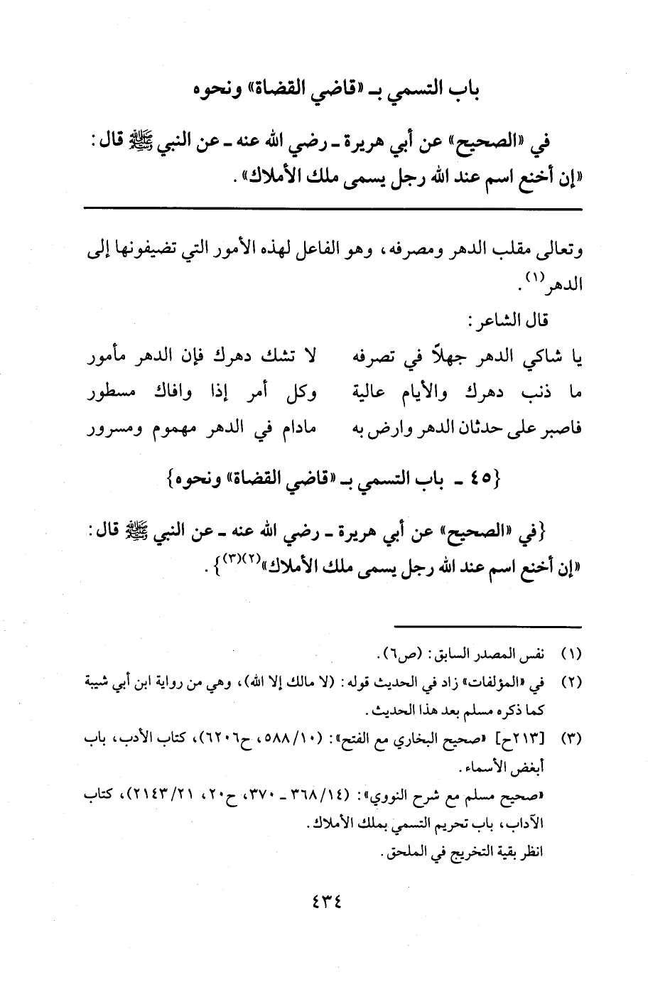 3 [213 ح] "صحيح البخاري مع الفتح": (10/ 588 , ح 6206) , كتاب الأدب, باب أبغض الأسماء."صحيح مسلم مع شرح النووي": (14/ 368- 370 , ح 20 , 21/ 2143) , كتاب الآداب, باب تحريم التسمي بملك الأملاك. انظر بقية التخريج في الملحق.