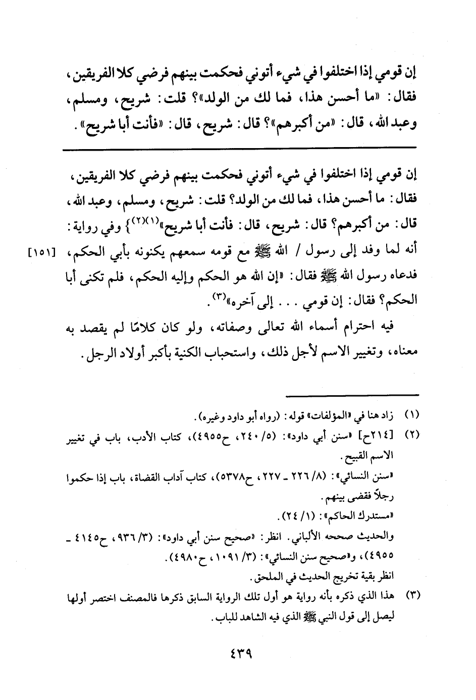 إن قومي إذا اختلفوا في شيء أتوني فحكمت بينهم فرضي كلا الفريقين، فقال: ما أحسن هذا، فما لك من الولد؟ قلت: شريح، ومسلم، وعبد الله، قال: من أكبرهم؟ قال: شريح، قال: فأنت أبا شريح "12 وفي رواية: أنه لما وفد إلى رسول الله صلى الله عليه وسلم مع قومه سمعهم يكنونه بأبي الحكم، فدعاه رسول الله صلى الله عليه وسلم فقال:"إن الله هو الحكم وإليه الحكم، فلم تكنى أبا الحكم؟ فقال: إن قومي ... إلى آخره".3 فيه احترام أسماء الله تعالى وصفاته، ولو كان كلاما لم يقصد به معناه، وتغيير الاسم لأجل ذلك، واستحباب الكنية بأكبر أولاد الرجل.