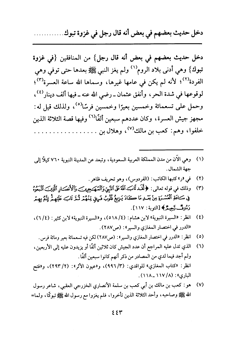 6 الذي تدل عليه المراجع أن عدد الجيش كان ثلاثين ألفا أو يزيدون عليه إلى الأربعين, ولم أجد فيما لدي من المصادر من ذكر أنهم كانوا سبعين ألفا. انظر:"كتاب المغازي"للواقدي: (3/ 996) , و"عيون الأثر": (2/ 293) , و"فتح الباري": (8/ 117- 118) .