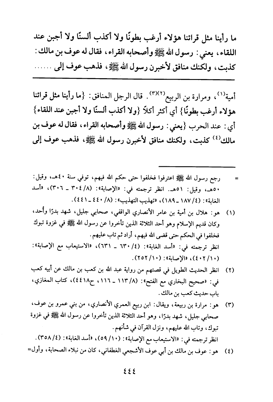 ما رأينا مثل قرائنا هؤلاء أرغب بطونا ولا أكذب ألسنا ولا أجبن عند اللقاء، يعني: رسول الله صلى الله عليه وسلم وأصحابه القراء، فقال له عوف بن مالك: كذبت، ولكنك منافق لأخبرن رسول الله صلى الله عليه وسلم فذهب عوف إلى